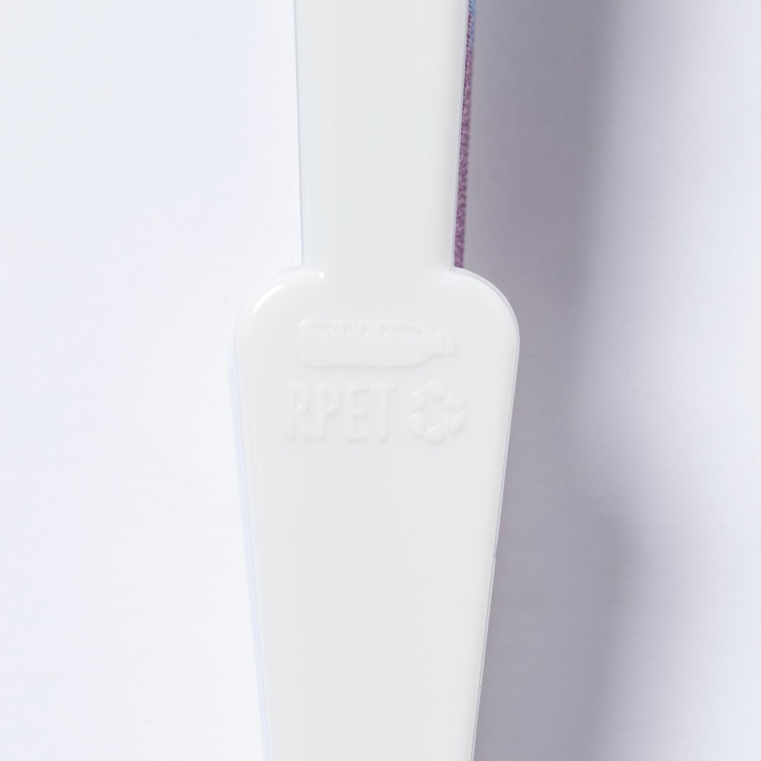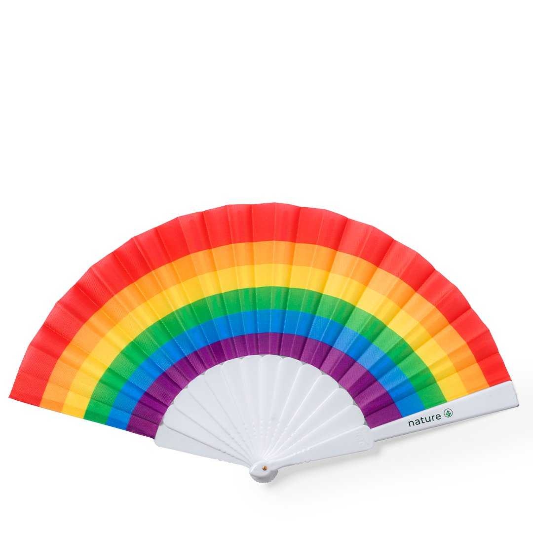 Abanico Rainbow con tela multicolor y varillas blancas en RPET. Todo un orgullo de abanico, con distintivo RPET en varilla e inyectado en molde. Presentación en caja individual blanca con ventana. El material RPET se elabora a partir de plástico reciclado, para así fomentar la reutilización de residuos plásticos y ayudar a la sostenibilidad del planeta.
