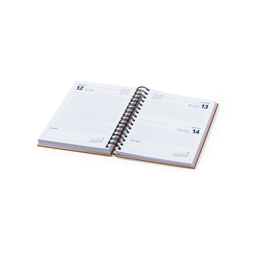 Agenda de tamaño A5 fabricada en elegante y sostenible cuero reciclado. Con cubiertas rígidas y elástico de cierre. Con distintivo cuero reciclado.Diseño página día, zona de anotaciones por día y páginas con esquina troquelada para marcar el día. En 2 idiomas: castellano e inglés. Presentado en caja kraft. El cuero reciclado rescata las fibras desechadas en los procesos de fabricación del cuero, minimizando el desperdicio de material, contribuyendo a reducir el impacto ambiental y manteniendo a la vez sus propiedades originales.