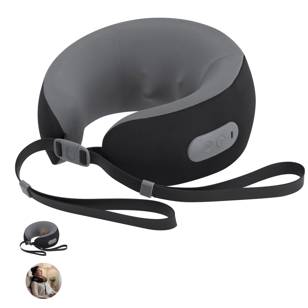 Almohadilla masajeador portátil para cuello. Máxima experiencia de confort para cualquier viaje gracias a la función de masajes. Tiene cierres de hebilla para un correcto y cómodo ajuste. Incluye botón de ON/OFF/SWITCH con indicador de luz. Con funda confeccionada en poliéster para protegerla en el transporte. Equipada con batería recargable de 1.200 mAh, con entrada TipoC.