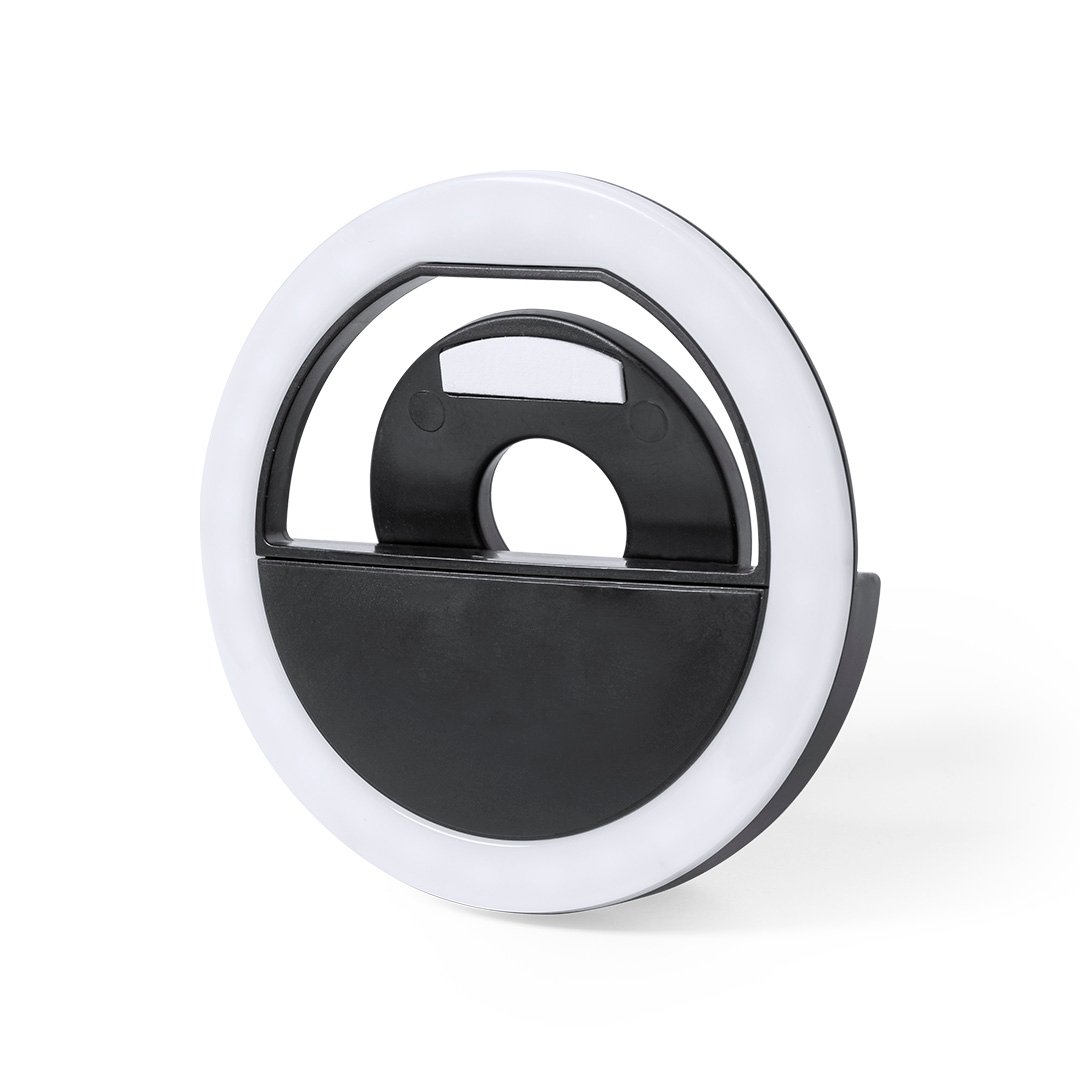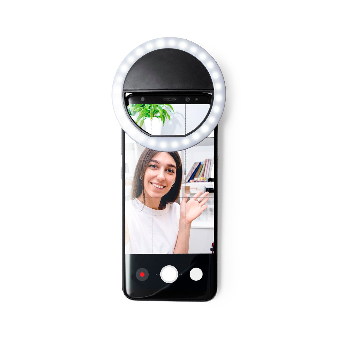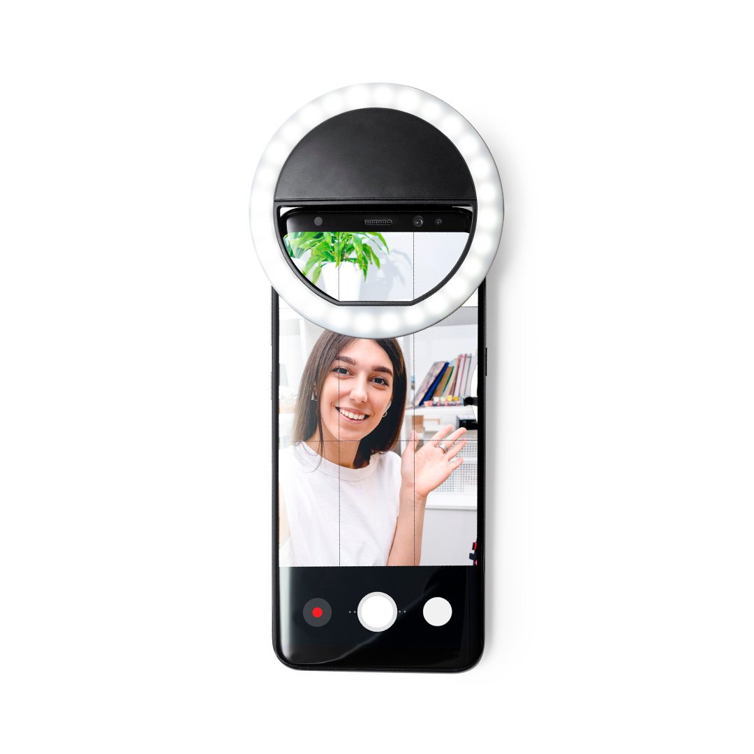 Anillo de luz led con acople para smartphone, fabricado en resistente ABS. 28 ledes, con 3 niveles de intensidad y recargable por USB (cable Micro USB incluido). Presentado en atractiva caja de diseño. Disponible manual en español e inglés.