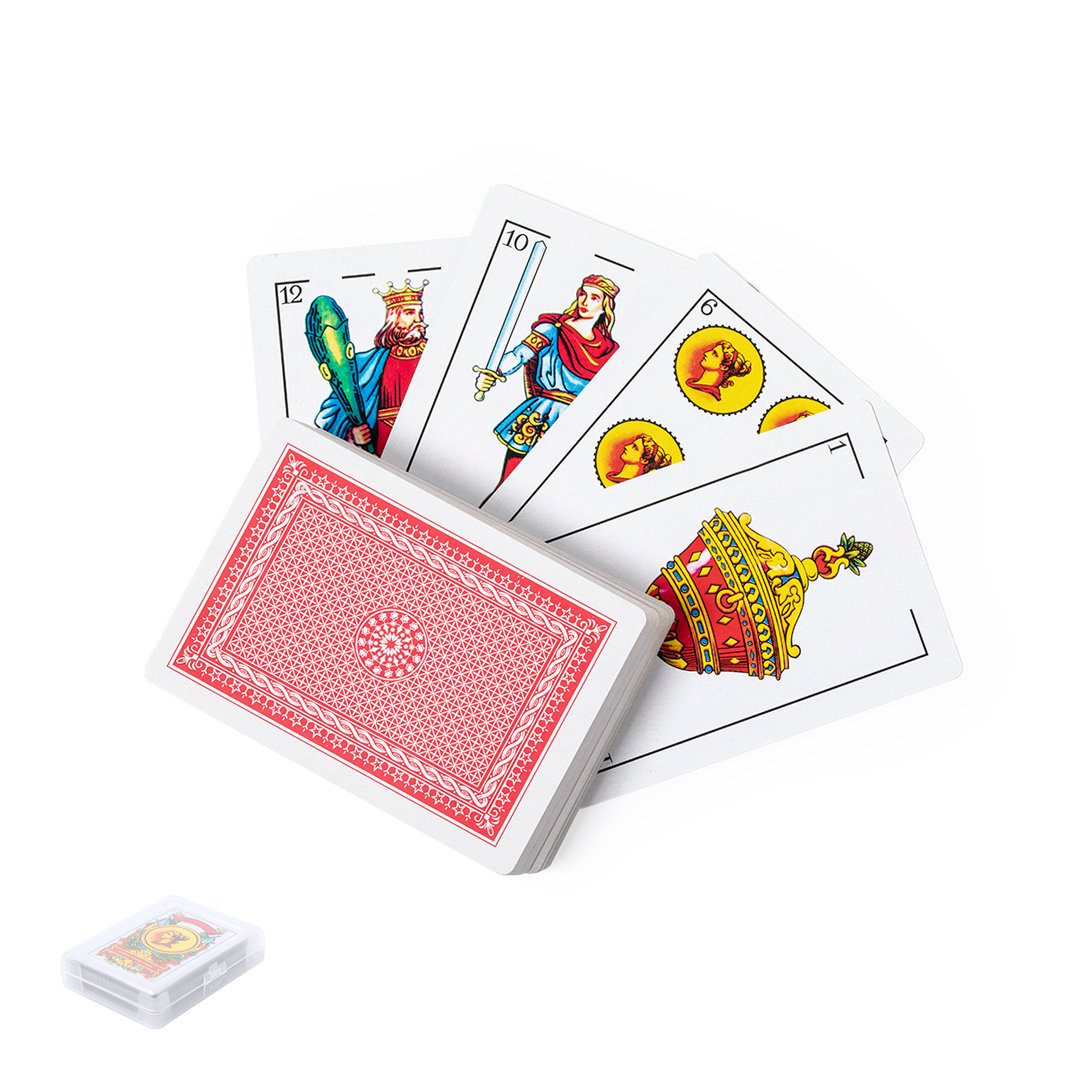 Baraja española fabricada en resistente papel laminado. Incluye 50 naipes, presentados en estuche individual de acabado translúcido y con cierre de seguridad.