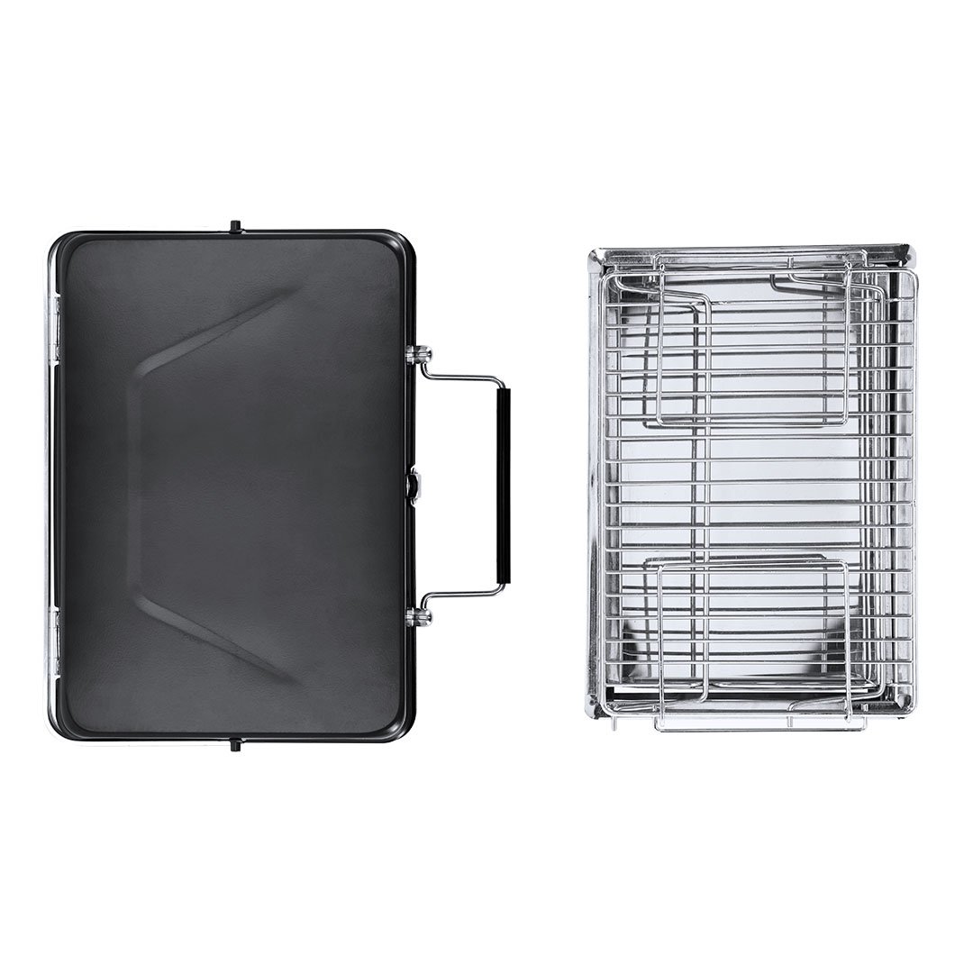 Barbacoa plegable acero inoxidable en acabado mate. Se pliega en formato maletín para hacer más fácil su transporte. Cuenta con una parrilla abatible haciendo más funcional su uso. Patas de sujeción antideslizantes plegables, otorgándole seguridad y estabilidad. Opción ideal para actividades al aire libre, eventos, comidas con amigos o familiares.