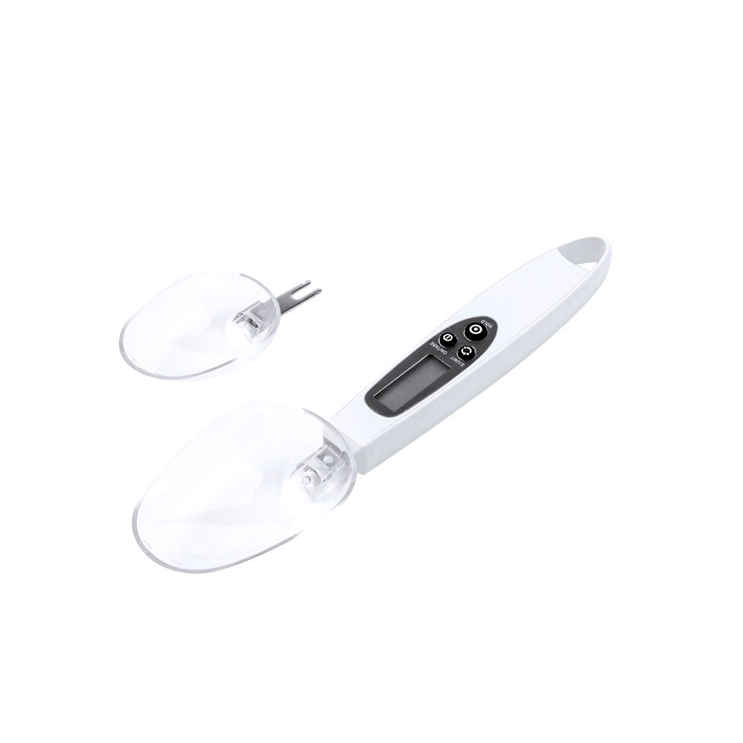 Práctica báscula digital con cuchara, válida para líquidos y sólidos. Incluye 2 cucharas intercambiables y pantalla digital LCD situada en el mango, mostrando el pesaje con una precisión de 0,1g. Botón para mostrar el peso en gramos (g), onzas (oz), o mililitros ( ml), con función de memoria y posibilidad de pesar dos ingredientes. Ambas cucharas llevan grabada una escala de medición adicional para líquidos: la cuchara pequeña desde 5 ml hasta 25 ml; y la cuchara grande desde 10 ml hasta 50 ml. Con manual de instrucciones en español e inglés. Alimentada por pila de botón (incluida) y presentada individualmente en caja de diseño kraft.