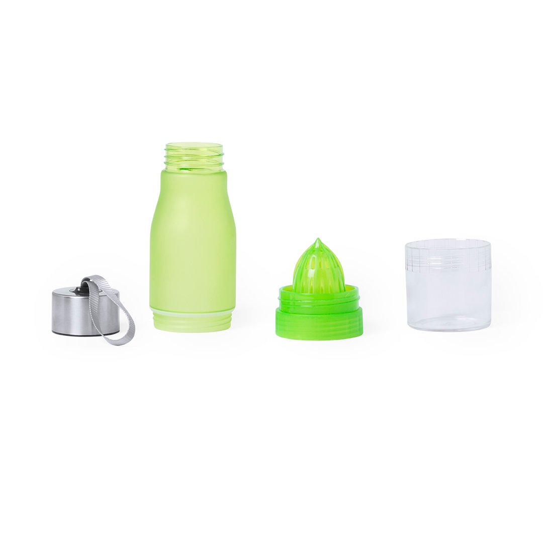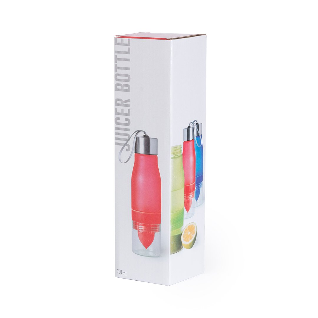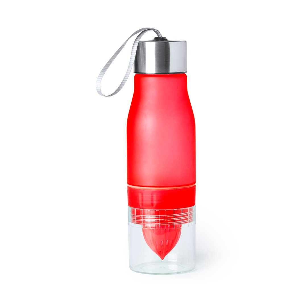 Original bidón de 700ml de capacidad en material tritán resistente al calor y libre de BPA. Incluye compartimento en base con exprimidor de cítricos para dar sabor al agua. Con dosificador, tapón a rosca y cinta de transporte. Disponible en variada gama de colores y presentado en caja individual.