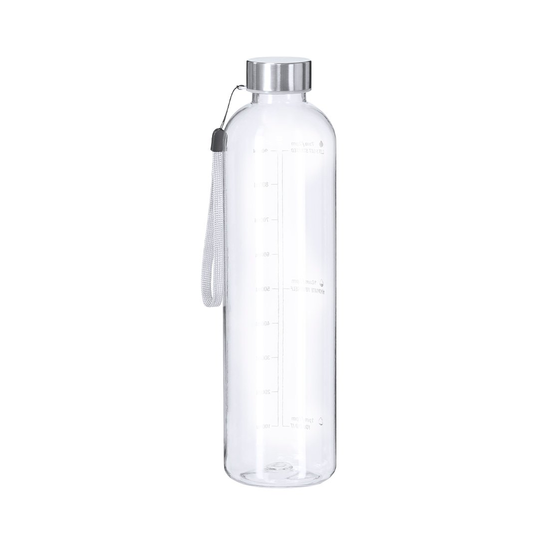 Bidón fabricado en RPET de 1L de capacidad, diseñado para fomentar una hidratación adecuada. Con cuerpo transparente. Incluye indicador de capacidad en litros y onzas, acompañado de frases motivadoras que inspiran a mantener una correcta hidratación diaria. Tapón, elaborado en Acero Inox, incluye práctico cordón para facilitar su transporte. Libre de BPA.