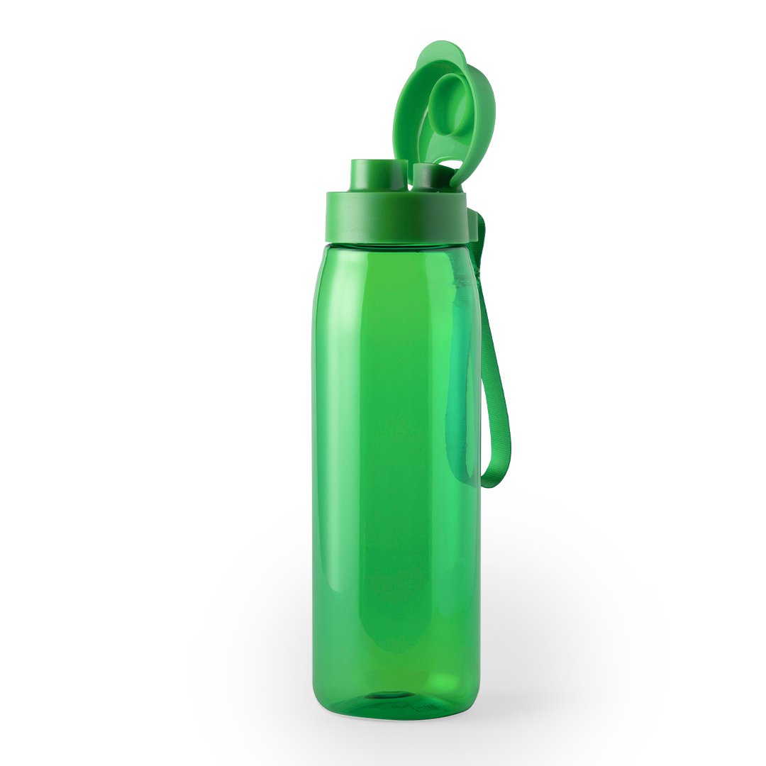 Bidón en alta calidad y de gran capacidad -820 ml- en material tritán resistente al calor y libre de BPA. Disponible en variada gama de colores transparentes, con tapón dosificador de seguridad a juego y cinta de transporte.