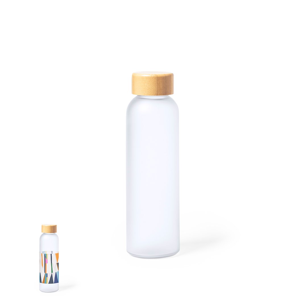 Bidón de línea nature y 500 ml de capacidad, fabricado especialmente para marcaje en sublimación. Cuerpo fabricado en cristal, con tapón a rosca de bambú y libre de BPA. Presentado en caja individual de diseño eco.