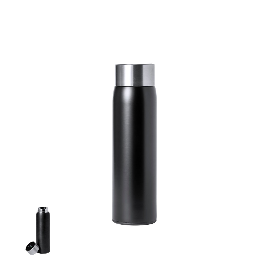 Bidón térmico de acero inox y doble pared, con medidor de temperatura táctil integrado en tapón. 500ml de capacidad y de acabado mate. Con tapón de seguridad libre de BPA y presentado en atractiva caja de diseño. Alimentación a pilas (de botón incluida) y disponible manual de instrucciones en español e inglés.