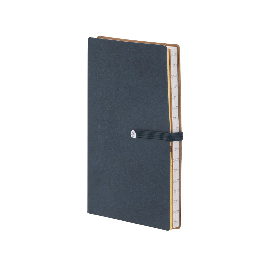 Bloc con notas adhesivas en cartón reciclado. Con tapas rígidas, incluye bloc de 70 hojas blancas de disposición a una raya. En la cubierta interior de la portada incluye: 25 hojas adhesivas amarillas 6×3,8 cm, 25 hojas adhesivas amarillas 7,5 x 9 cm y 100 mininotas adhesivas de varios colores y práctico bolígrafo en cartón reciclado de tinta azul con sistema pulsador. Incluye cinta elástica a juego para asegurar cierre.