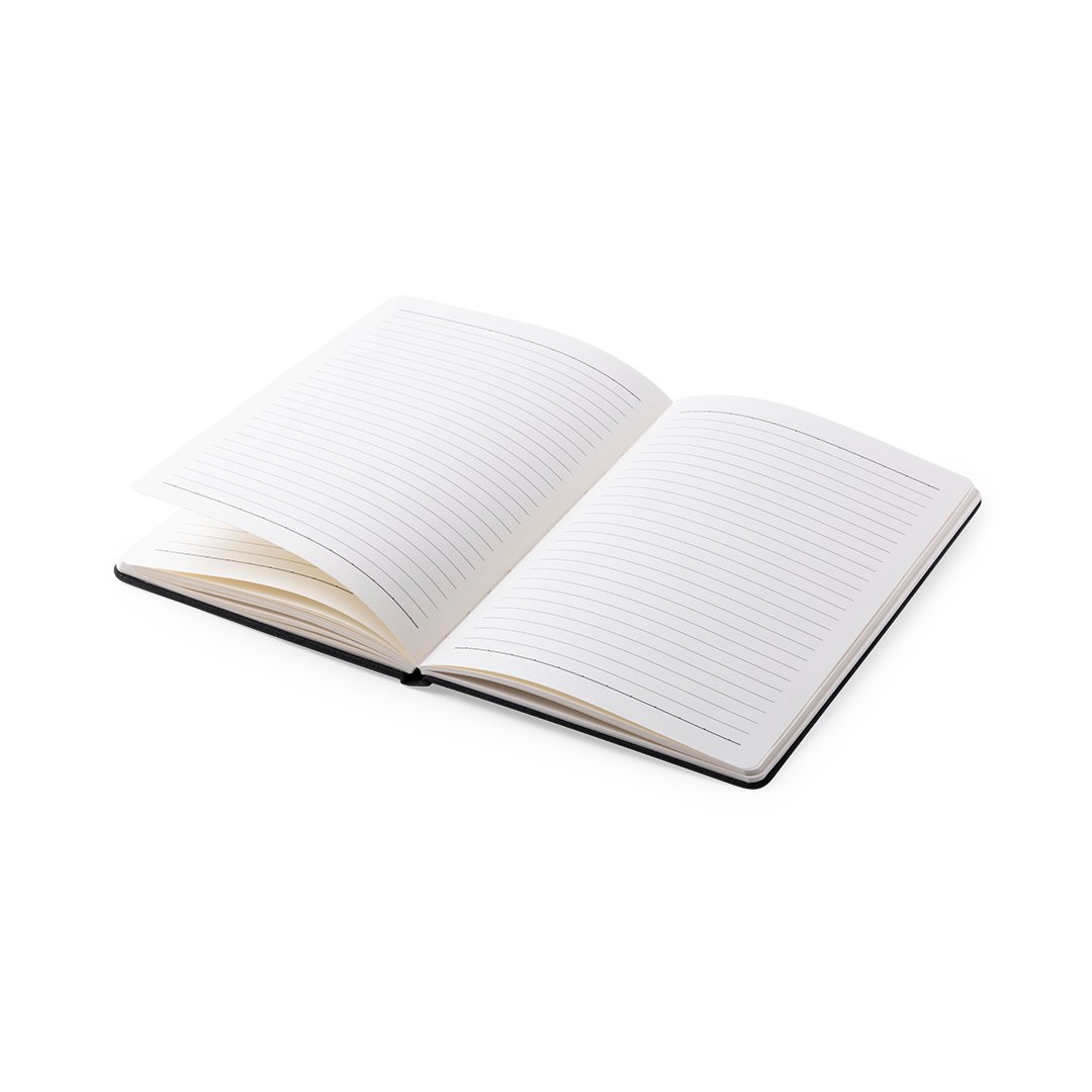 Bloc de notas cargador en resistente poliéster 300D con cargador inalámbrico integrado. De sobrio diseño y original estación de carga en la portada. Incluye 80 hojas con disposición a una raya.