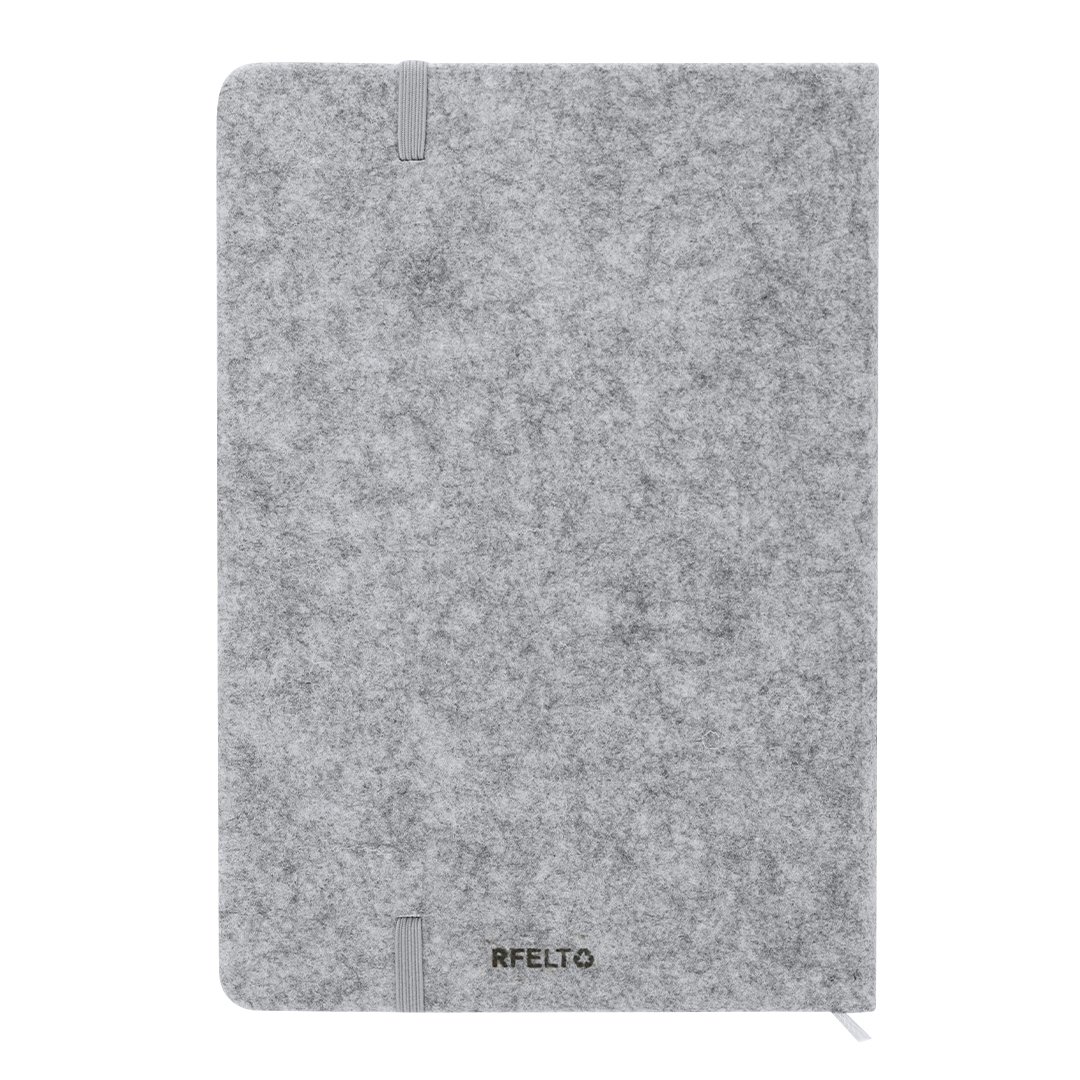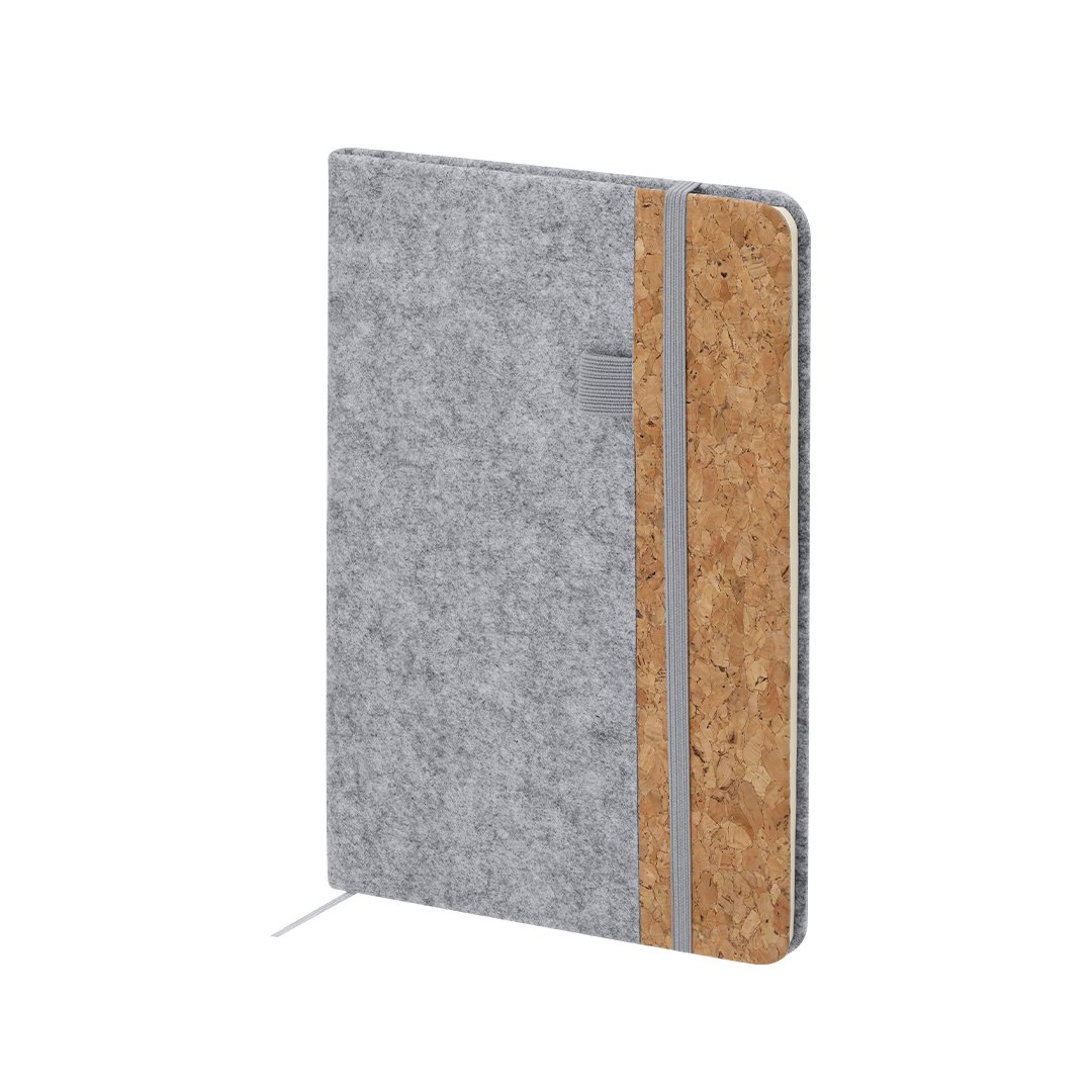 Bloc de notas con tapas rígidas elaboradas en combinación de fieltro RPET y corcho. Incluye 80 hojas a una raya con elástico de sujeción para bolígrafos en portada, banda elástica de cierre y marcapáginas a juego. Incliye distintivo RFELT.Elaborado con elementos vegetales para así fomentar la utilización de materias primas naturales y reducir las emisiones contaminantes.El fieltro RPET es fruto de la combinación del proceso de reciclaje de materiales plásticos junto con la técnica milenaria de fabricación del fieltro, dando como resultado un material de eco-tendencia que, además de ser de origen reciclado, también se convierte en reciclable.