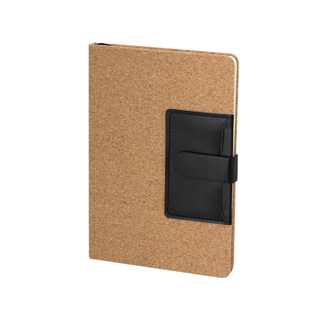 Bloc de notas de tapas rígidas en combinación de corcho natural y PU. Incluye bolsillo de PU en portada, ideal para tarjetas. Con cierre magnético, 80 páginas de disposición a una raya y marcapáginas a juego.Elaborado con elementos vegetales para así fomentar la utilización de materias primas naturales y reducir las emisiones contaminantes.
