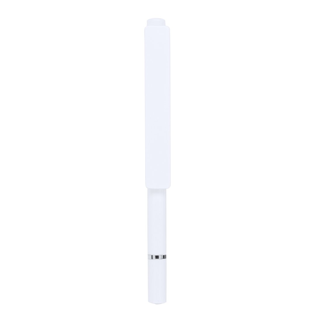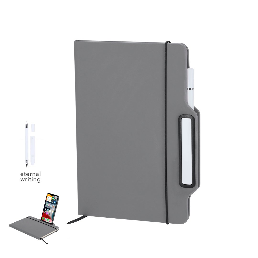 Bloc de notas soporte fabricado en suave PU. Con tapas rígidas,cuenta con soporte para smartphone en portada. Incluye bolígrafo de escritura eterna en color blanco. Con 80 hojas interiores lisas de color crema, elástico de cierre negro y marcapáginas a juego.