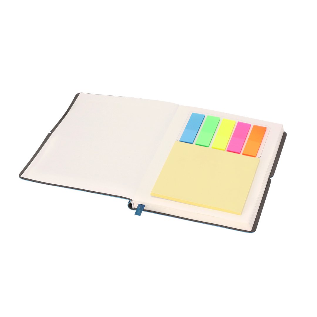 Portada Flexible. 80 Hojas. 25 Notas Adhesivas 7,5 x 7,5 cm. 125 Mininotas Adhesivas 1,2 x 4,5 cm. PU Reciclada.