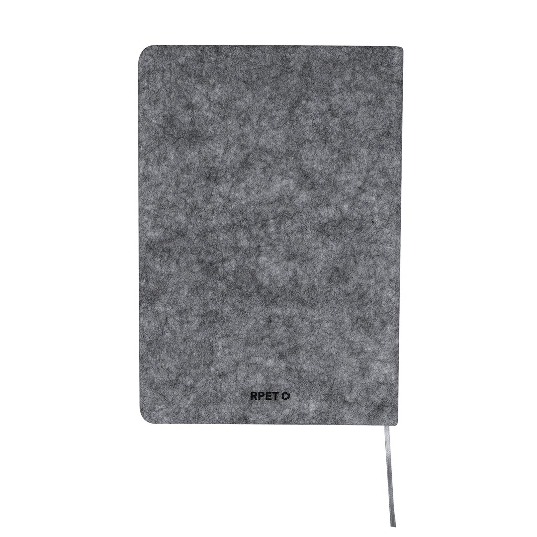 Bloc de notas de tapas rígidas, elaboradas en fieltro RPET. Incluye bolsillo de corcho cosido en portada. Contiene 80 páginas de disposición a una raya, marcapáginas y soporte elástico para bolígrafo a juego. Distintivo RPET en contraportada. El material RPET se elabora a partir de plástico reciclado, para así fomentar la reutilización de residuos plásticos y ayudar a la sostenibilidad del planeta.