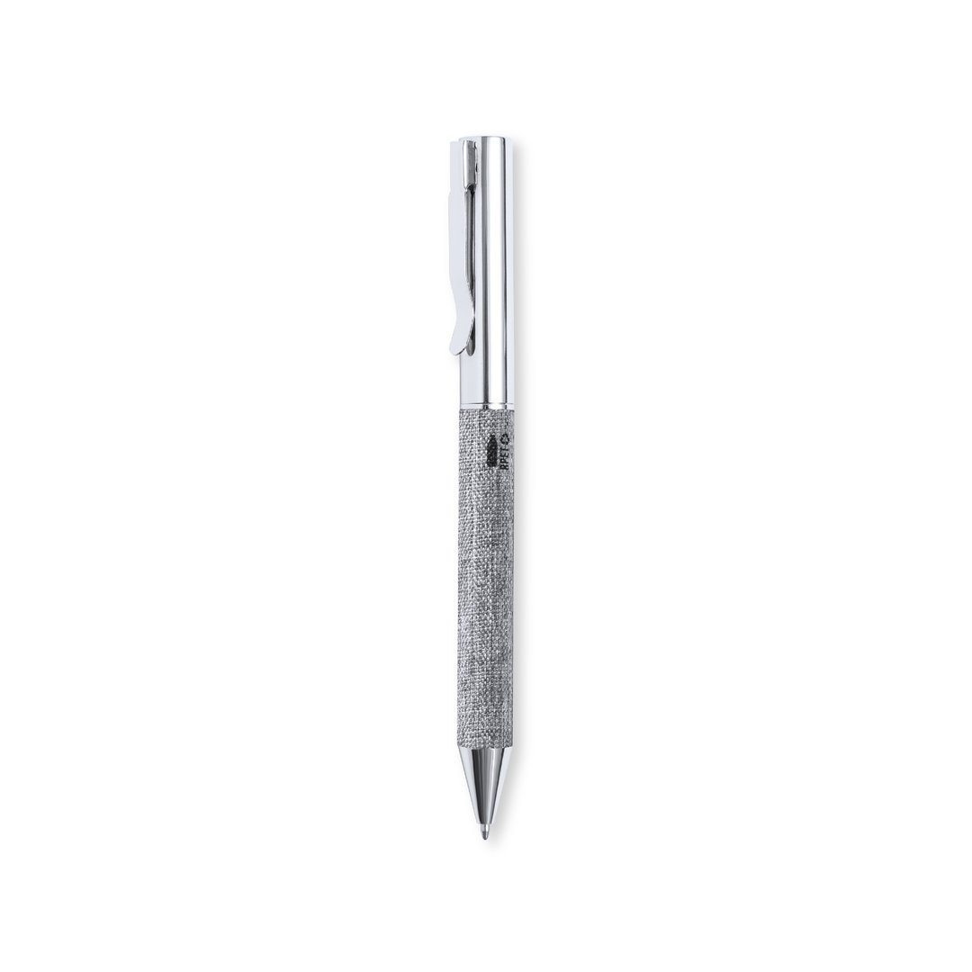 Bolígrafo fabricado en metal cromado y con cuerpo recubierto en poliéster RPET, elaborado a partir de plástico reciclado para así fomentar la reutilización de residuos plásticos y ayudar a la sostenibilidad del planeta. Elegante clip metálico y accesorios a juego, de mecanismo giratorio y en tinta azul. Con distintivo RPET en cuerpo y presentado estuche kraft con funda a juego.