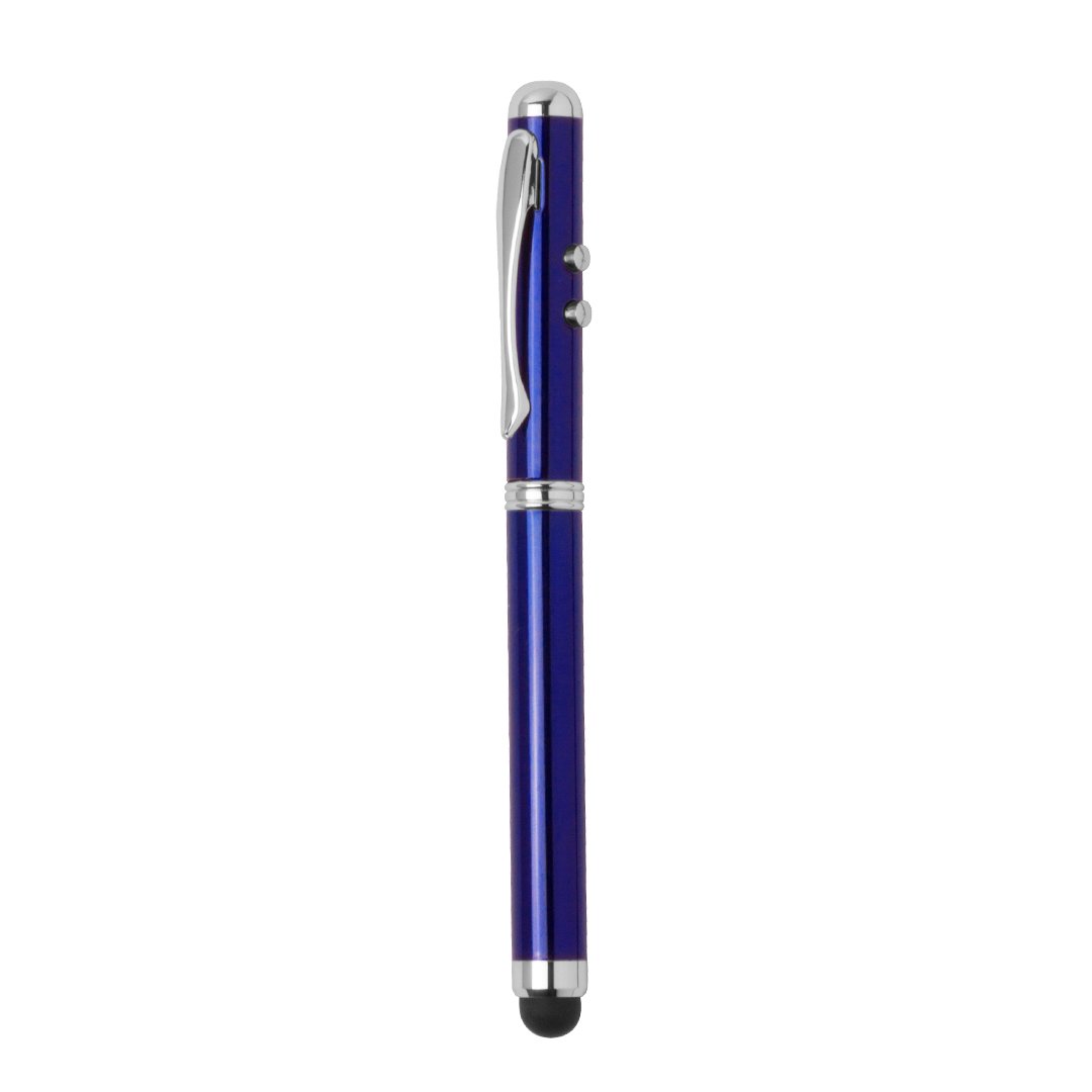 Bolígrafo láser metálico en elegante acabado brillo, con pulsadores de activación laterales para funciones láser y linterna (pilas de botón incluidas). En tinta azul, con puntero táctil integrado, cierre de capucha y clip cromado. Especialmente diseñado para marcaje en láser. Presentado en un elegante estuche metálico en caja individual de cartón de acabado plateado. Interior en suave esponja troquelada, con pilas de recambio.