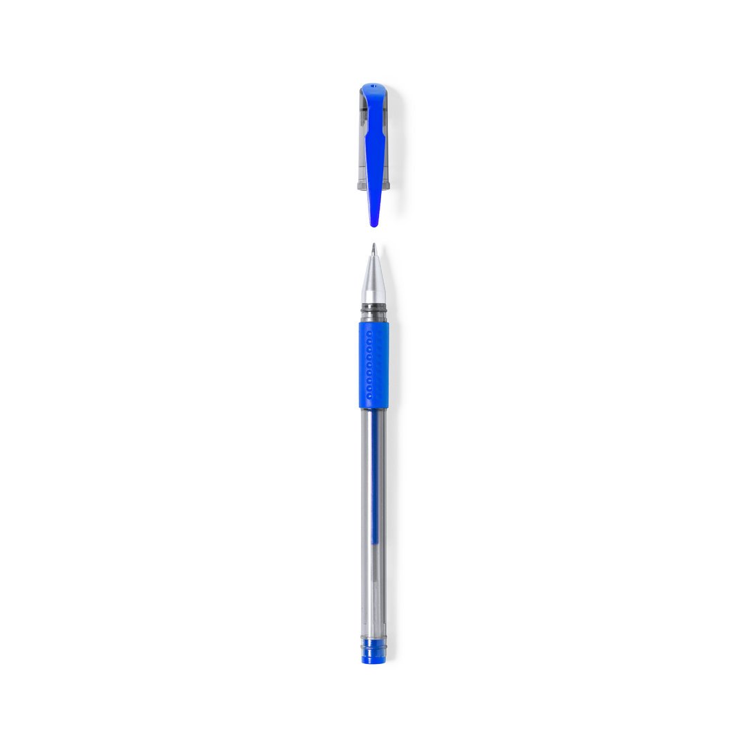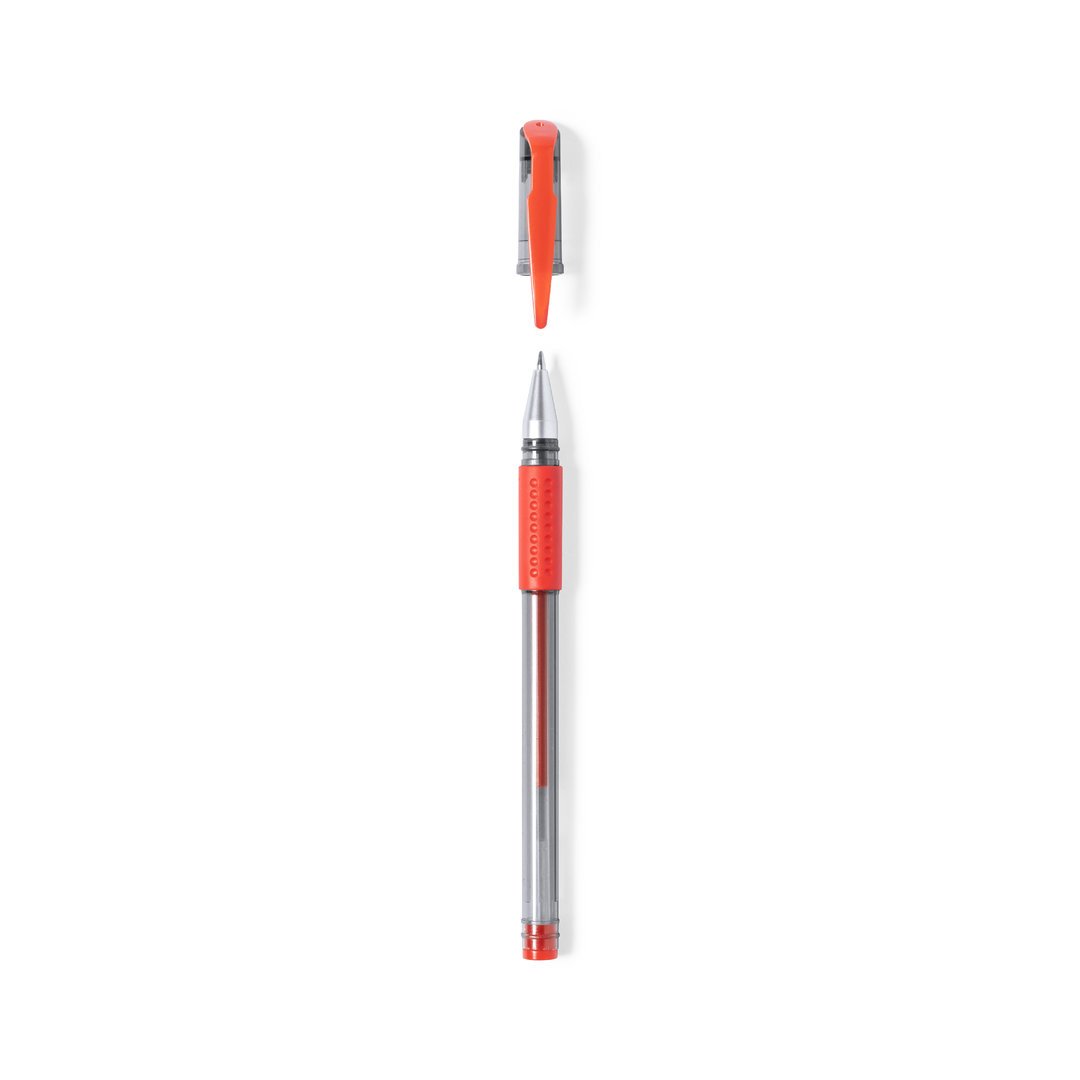 Bolígrafo en tinta gel de original diseño transparente, con empuñadura, capucha y detalles a juego. Disponible en varios colores de escritura, con tinta en el mismo color que los acabados del bolígrafo.