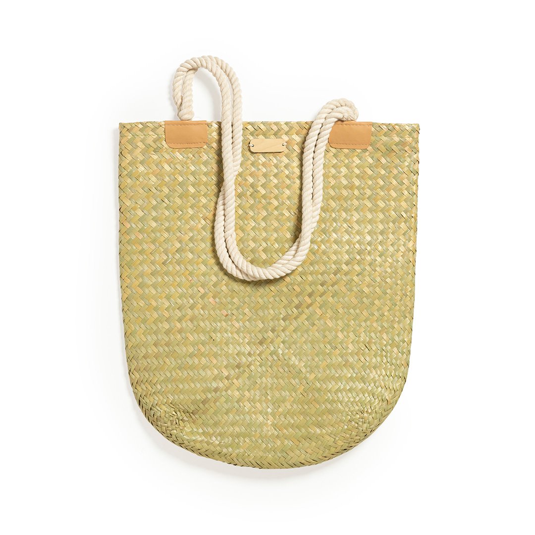 Bolso de desenfadado diseño en paja y con forma rectangular, un must. De gran capacidad y con originales asas largas en algodón, reforzadas en PU. Con superficie para personalización en madera, especialmente diseñada para marcaje en láser.