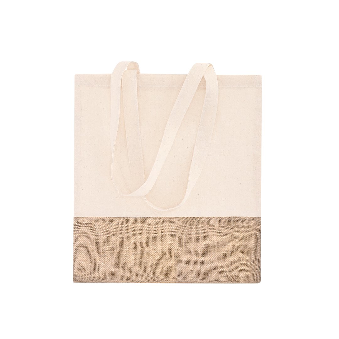 Bolsa ecológica en resistente combinación de materiales naturales -yute y algodón- de 245g/m2. Con atractivo diseño bicolor y acabado cosido. Asas largas de 70 cm reforzadas y resistencia hasta 8kg de peso.