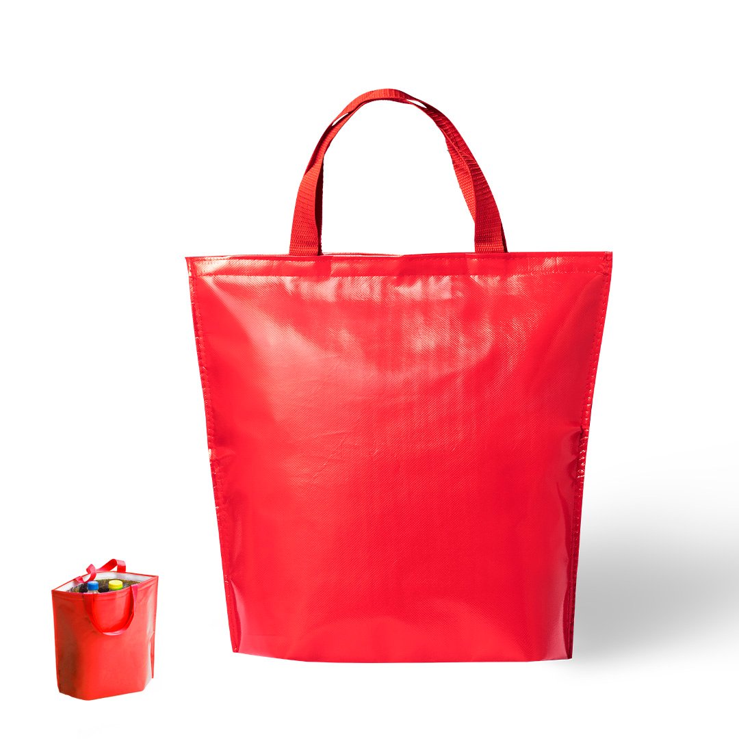 Bolsa nevera en resistente non-woven de acabado laminado brillante y cierre de velcro. Con cómodas asas de transporte en nylon a juego e interior isotermo en acabado de aluminio. Resistencia hasta 7kg de peso.