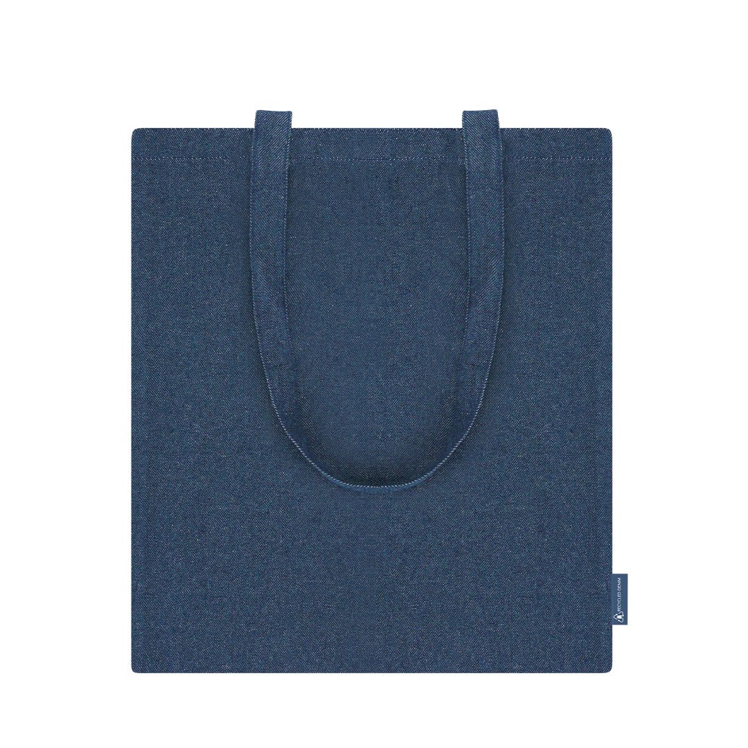 Bolsa confeccionada en tejido vaquero reciclado de 300 g/m2. Asas largas de 70cm con refuerzo, de acabado cosido. Logotipo de Denim Reciclado en etiqueta lateral y resistencia hasta 8 kg de peso.