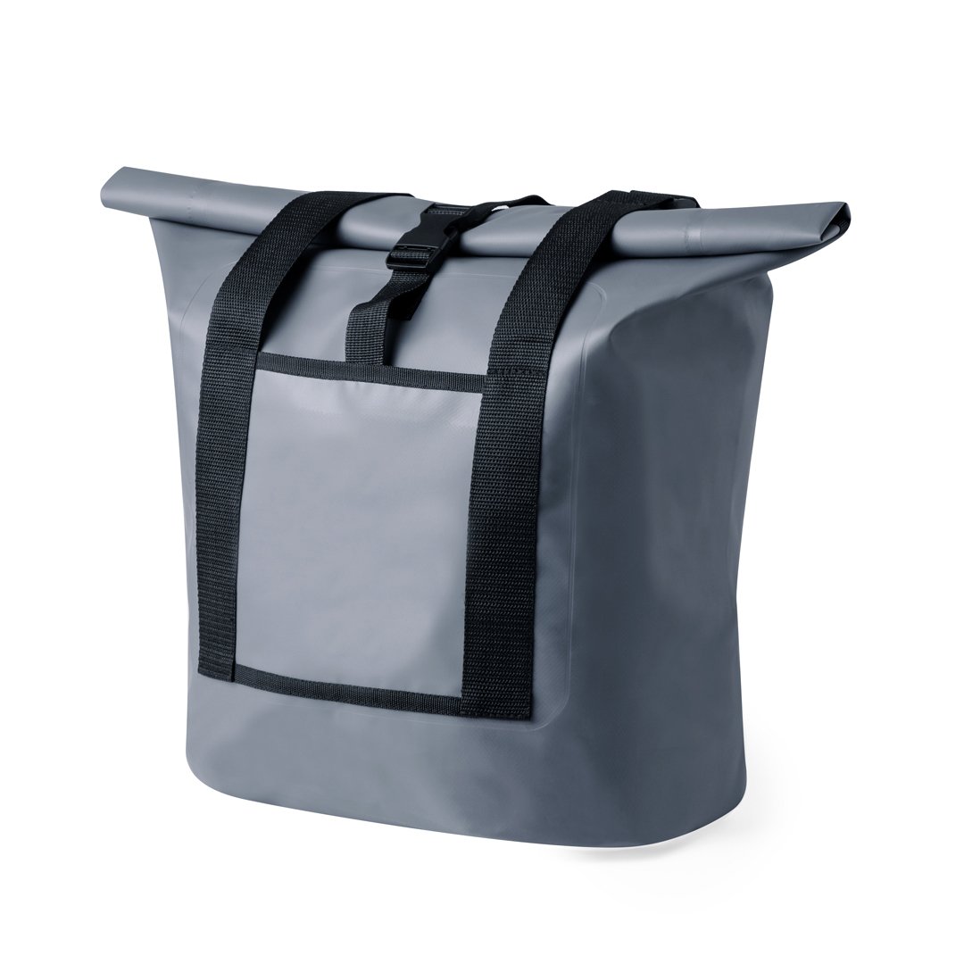 Bolso impermeable de 25L de capacidad, confeccionado en resistente PVC. Compartimento principal con cierre de hebilla y asas ajustables para un cómodo transporte. Incluye bolsillo frontal abierto de fácil acceso. En elegante color gris con detalles en negro y presentado en bolsa individual reciclada.
