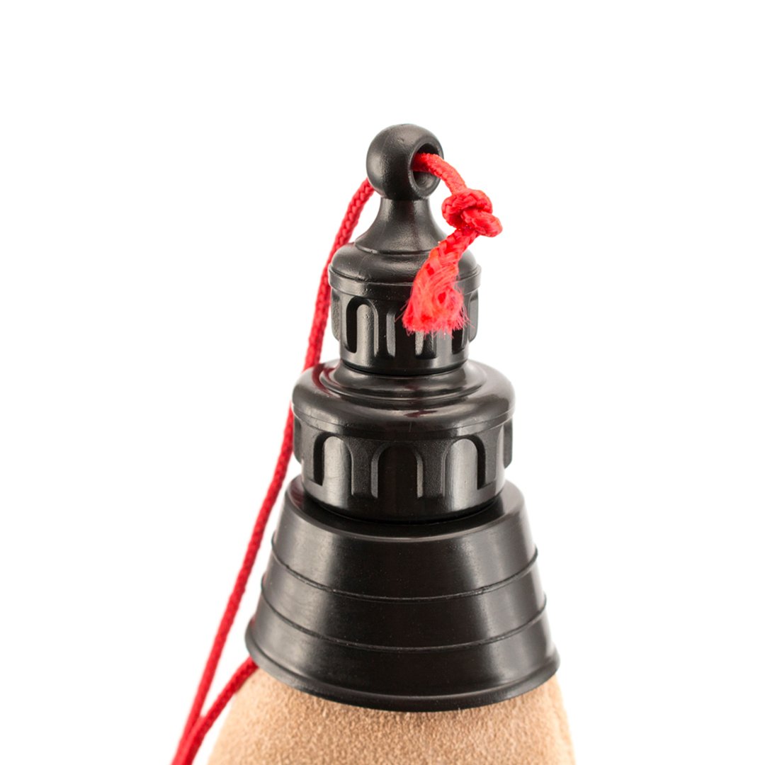 Bota de vino de 1l de capacidad en piel de serraje. Con tapón de seguridad a rosca y cinta bandolera. Homologada para uso alimentario