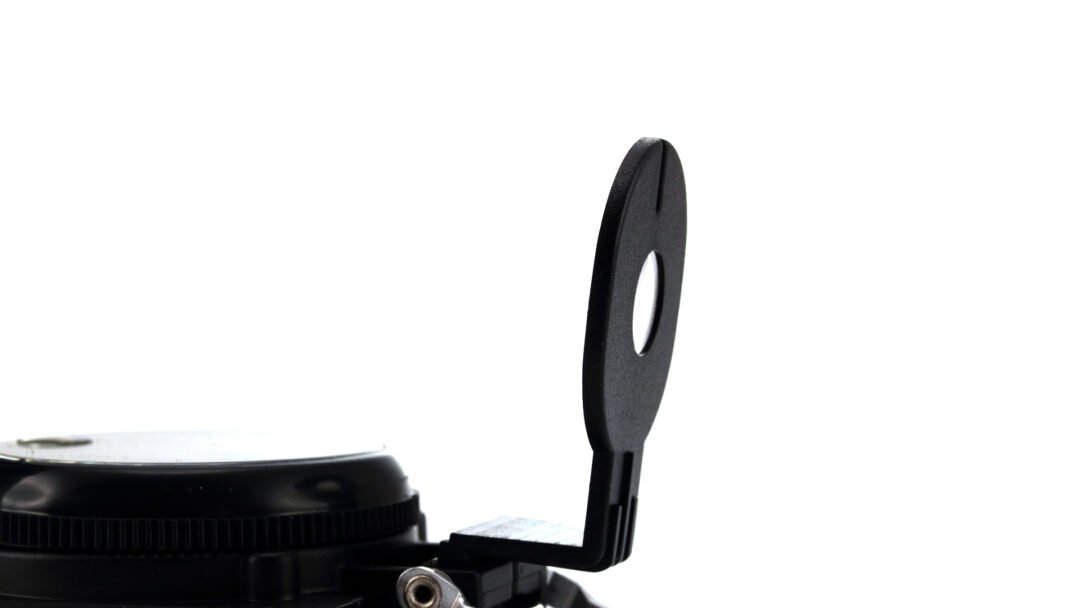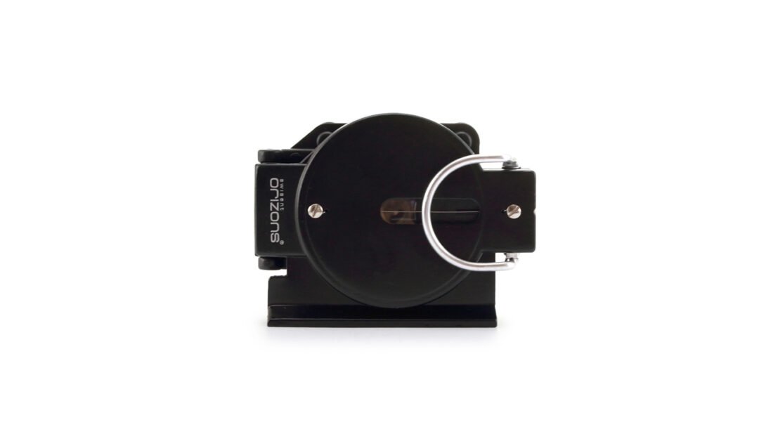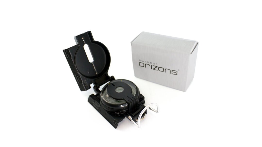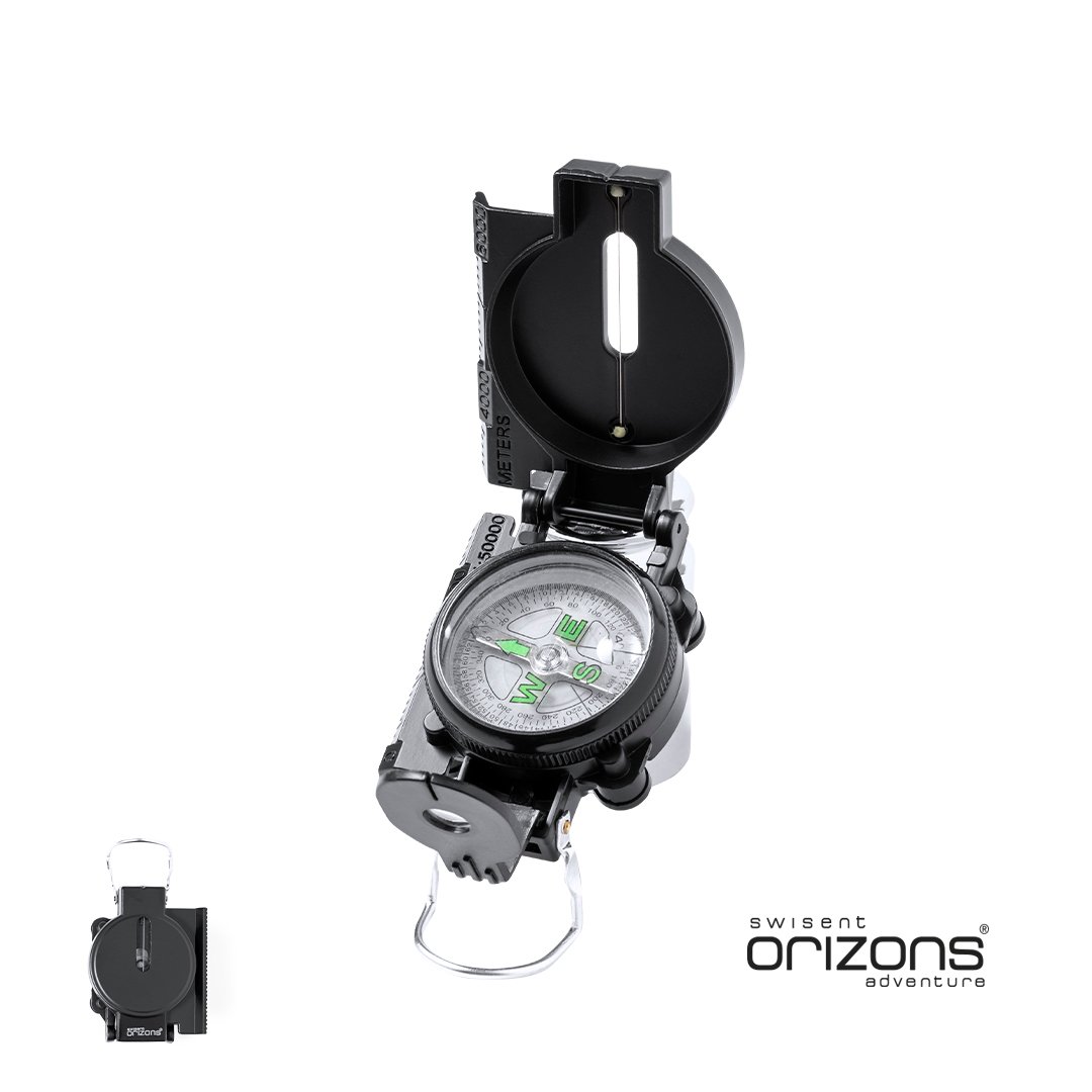 Brújula de Orizons de alta precisión con cuerpo en resistente aluminio, accesorio de fijación y presentada en atractiva caja de diseño con logotipo de la marca.