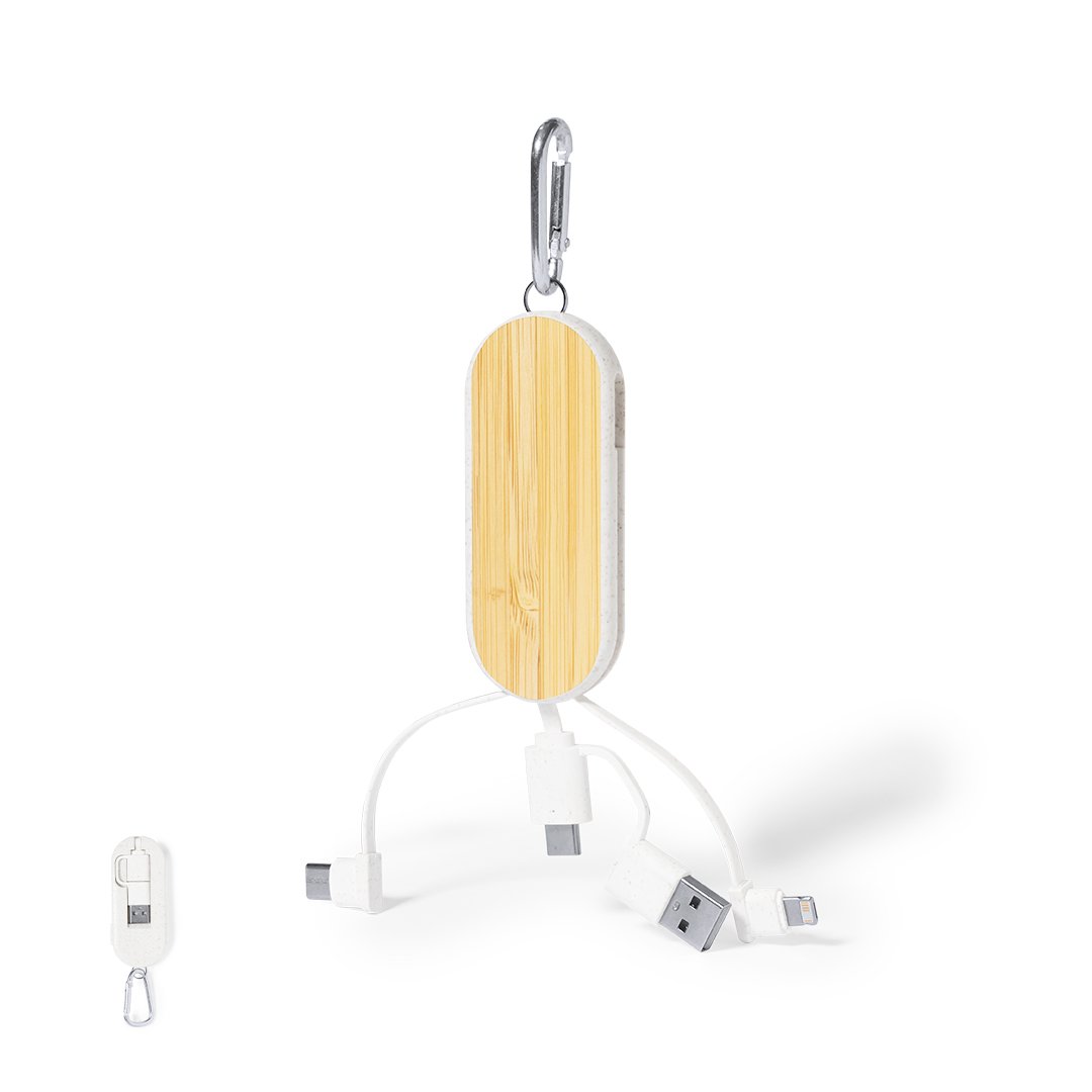 Cable cargador con mosquetón fabricado en fibra de trigo y bambú. Con conexiones de entrada Tipo C y USB y salidas Tipo C, lightning y Micro USB. 5V DC 2A. Presentado en bolsa individual de diseño kraft.Elaborado con elementos vegetales para así fomentar la utilización de materias primas naturales y reducir las emisiones contaminantes.