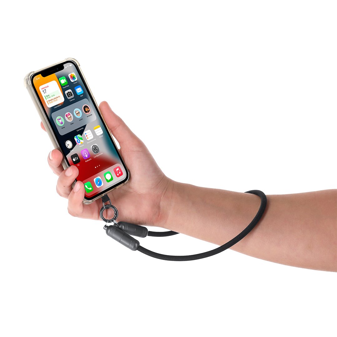 Lanyard cable de carga con función de transferencia de datos y soporte para móvil. Con entrada/salida Tipo C y capacidad de 60W , lo que permite una carga rápida. Funcionalidad y comodidad en un solo accesorio.