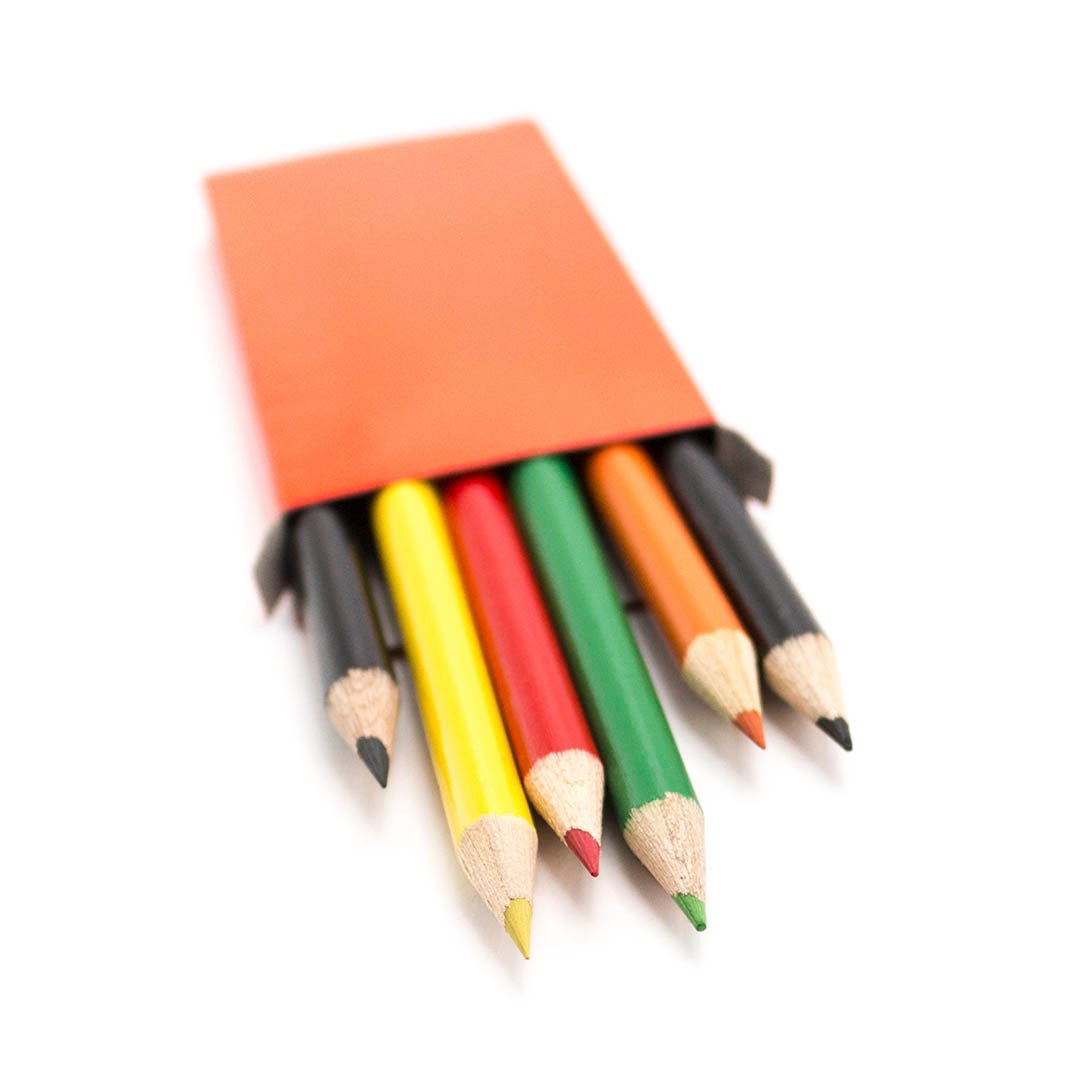 Set de 6 lápices en caja de cartón con acabado brillante en vivos colores y ventana. Lápices de madera con cuerpo cilíndrico en variados colores brillantes y minas en divertidos colores.