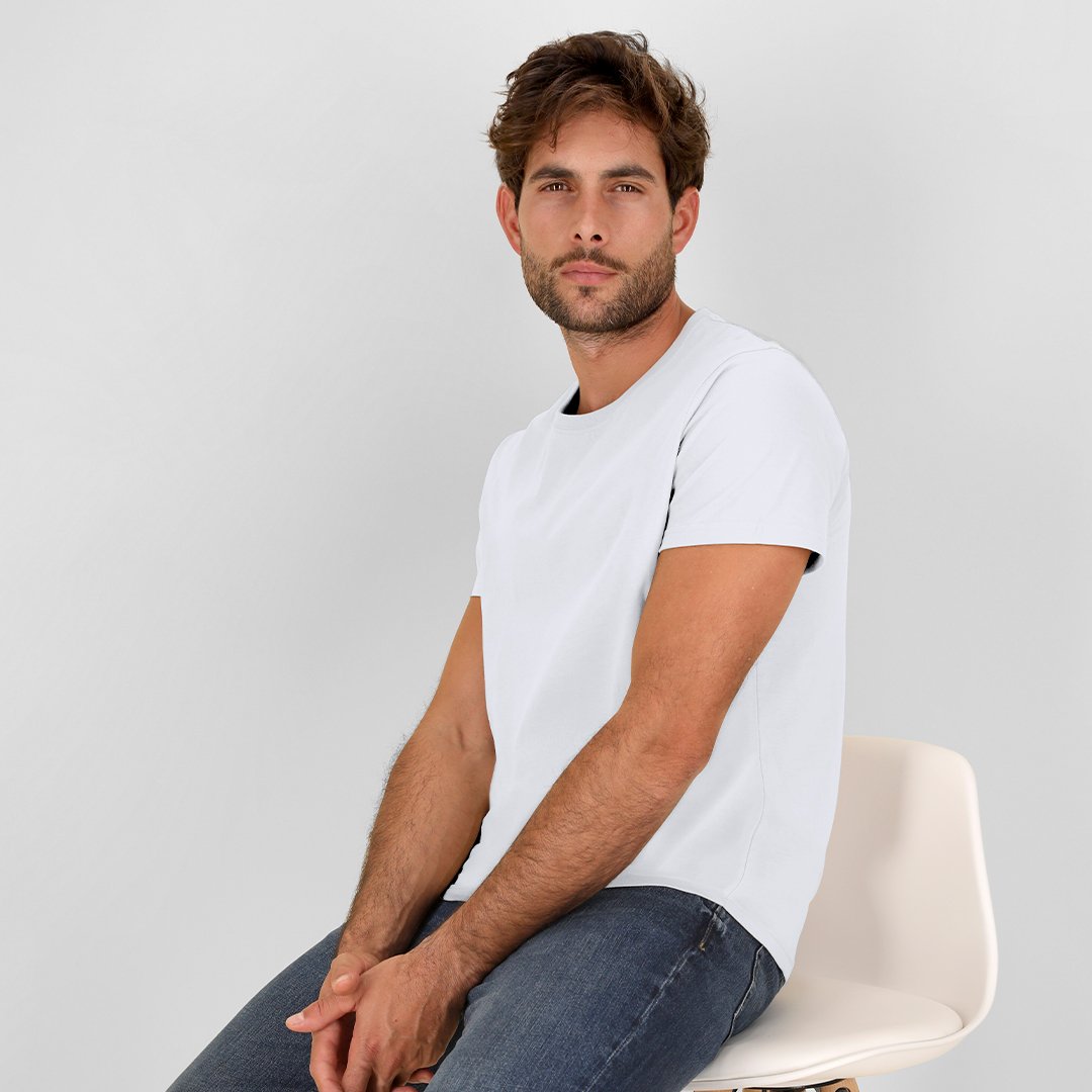 Camiseta de manga corta unisex confeccionada en algodón de punto liso de 170 g/m2. Con cuello redondo de 4 capas en canalé 1×1. Cuenta con costuras laterales y cubre costuras de hombro a hombro.