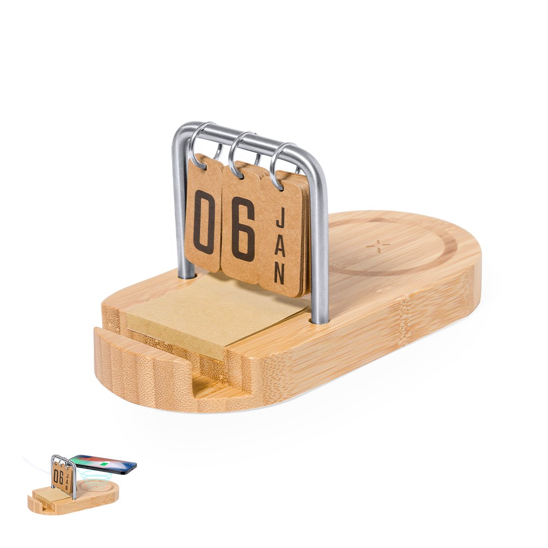 Cargador multifunción inalámbrico 15W fabricado en bambú. Incluye soporte para smartphone y calendario perpetuo, además de un bloc con 50 notas adhesivas acabado kraft de 4,5×4,5 cm. Salida USB y entrada y salida Tipo C, permitiendo cargar de manera simultánea hasta 3 dispositivos (1 mediante carga inalámbrica, 1 mediante cable Tipo C y 1 por cable USB). Compatible con dispositivos equipados con tecnología de carga inalámbrica. Amplia superficie de marcaje y presentado en caja individual de diseño kraft.Materiales como el bambú fomentan la utilización de materias primas naturales, reduciendo las emisiones contaminantes. Proviene de una planta de gran resistencia y versatilidad, con crecimiento y regeneración rápidos, siendo una excelente alternativa al uso de madera tradicional.Fabricado conforme a los estándares RoHS y en cumplimiento con los siguientes requisitos de seguridad:Sistema de protección contra sobrecalentamiento.Sistema de protección contra sobrecarga.Sistema de bloqueo para evitar cortocircuitos.