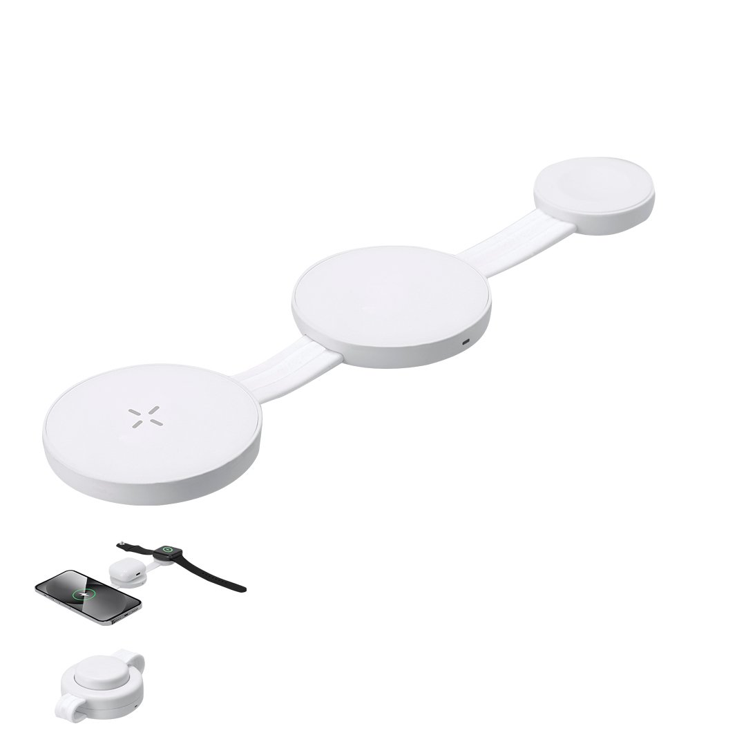 Cargador inalámbrico magnético 3 en 1 de 15W, fabricado en ABS. Diseñado para la carga simultánea del smartphone, auriculares y smartwatch y de tamaño ultra compacto. Un gadget todo en uno: plegable, portátil, muy versátil y de diseño funcional. Conexión por usb Tipo C -cable incluido-.