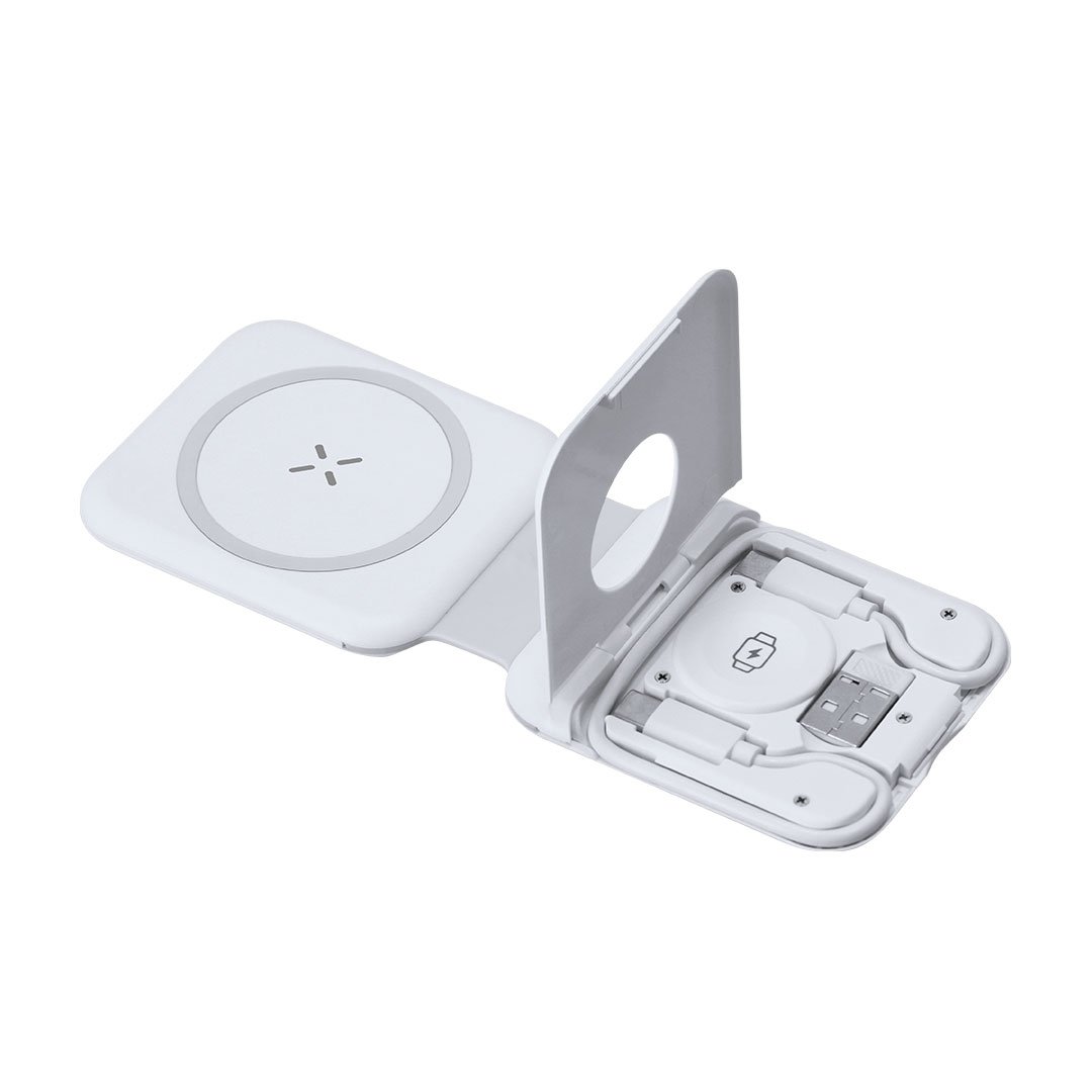 Completo multicargador inalámbrico 15W con soporte para gadgets 3 en 1 plegable. Diseñado para la carga simultánea del smartphone/auriculares y smartwatch: una estación de carga todo en uno. Incluye set de cables Tipo C y adaptador USB, aptos para la transferencia de datos.