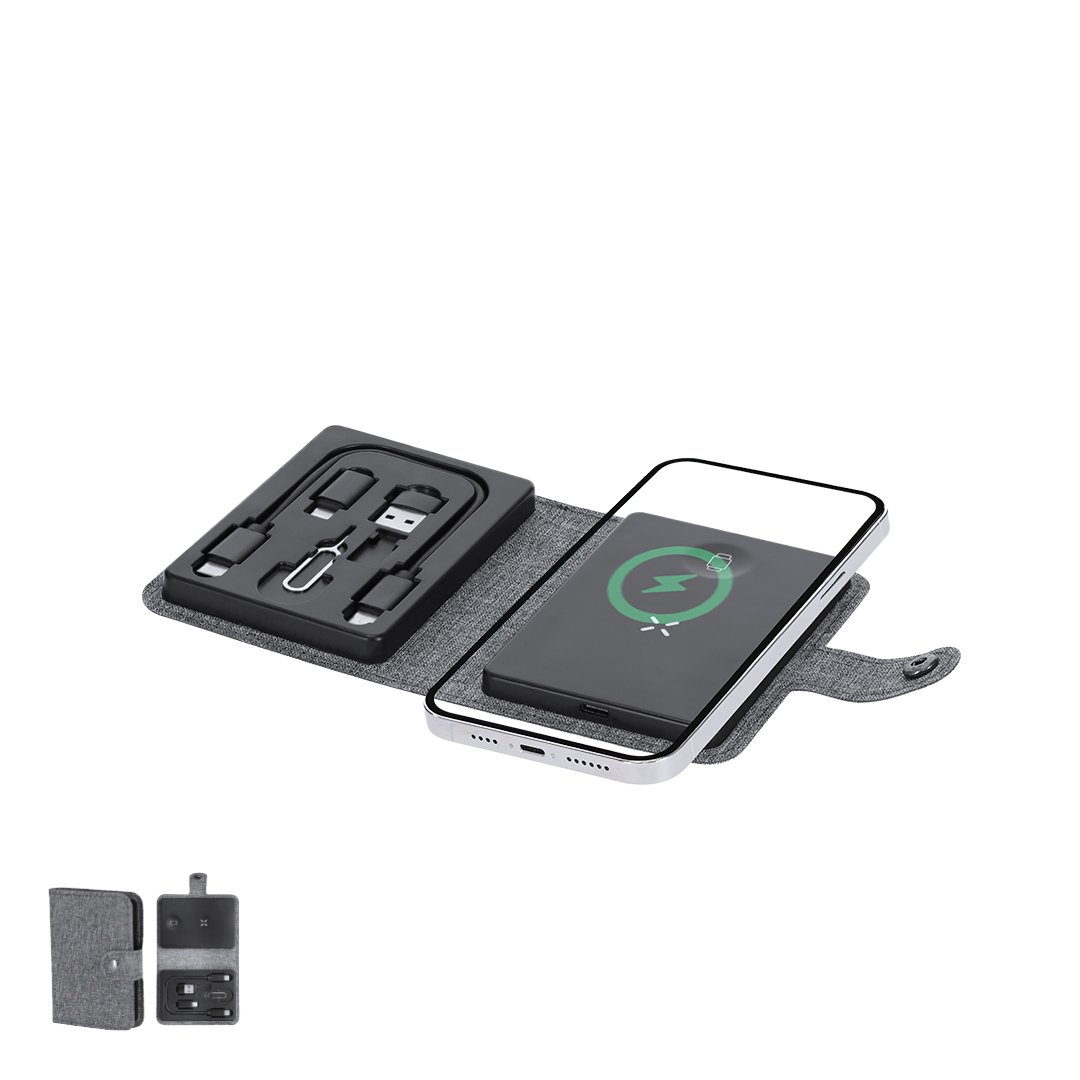 Completa base cargadora fabricada en 300D RPET. Estuche con cierre de corchete incluyendo base cargadora inalámbrica Qi para smartphone, auriculares y smartwatch. Contiene cable de conexión Tipo C en ambos extremos, además de adaptadores USB y lightning/micro USB. El set lo completa un eyector de tarjeta SIM y un compartimento para guardar una tarjeta Micro SIM. Con distintivo RPET.El material RPET se elabora a partir de plástico reciclado, para así fomentar la reutilización de residuos plásticos y ayudar a la sostenibilidad del planeta.