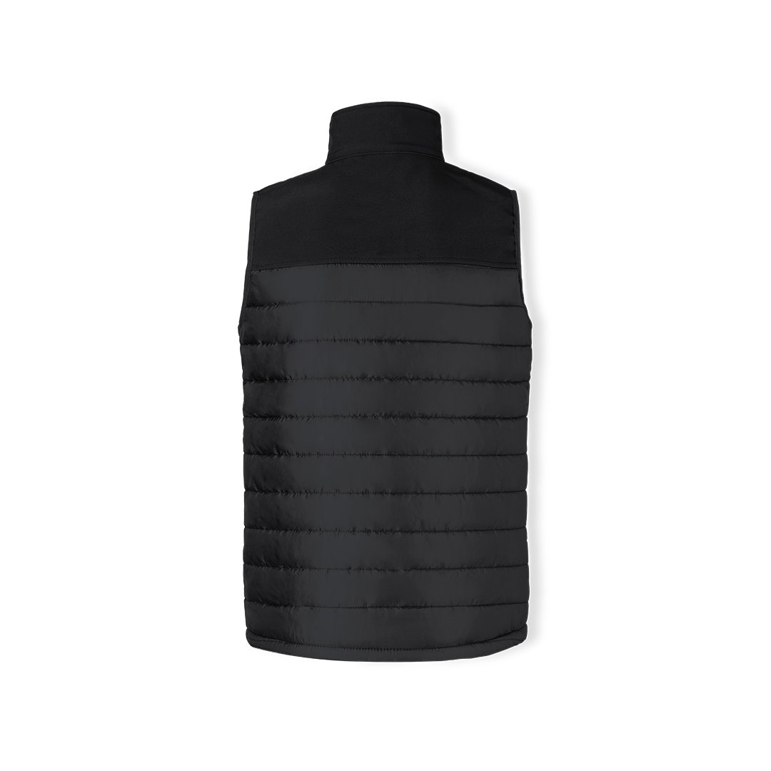 Chaleco impermeable y transpirable en combinación de materiales soft shell y poliéster. De elegante construcción en color negro, con cierre de cremallera y bolsillos laterales de cremallera con tiradores para fácil apertura. Disponible en tallas S, M, L, XL, XXL.