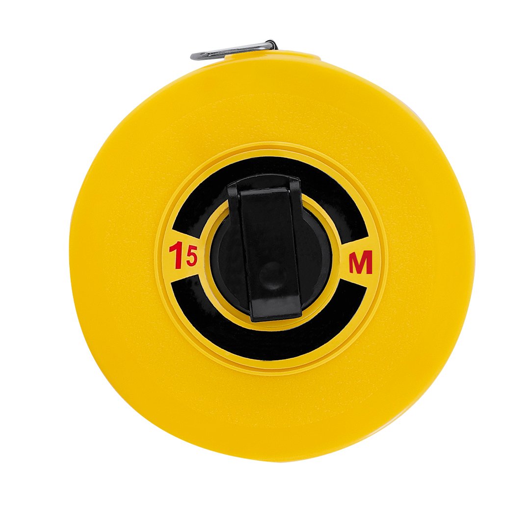 Cinta métrica 15 metros de largo en estuche PP y mecanismo en manivela. Escala impresa en cinta de PVC en negro para cm, y rojo para las pulgadas.