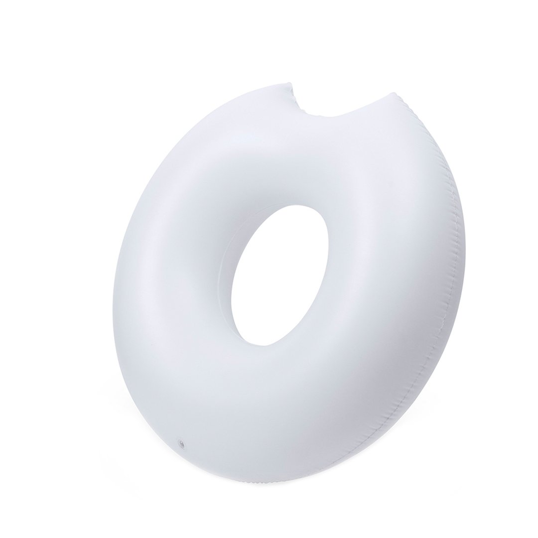 Original colchoneta inflable en PVC de tamaño maxi y en forma de donut con bocado. Presentada con plegado especial para fácil impresión.