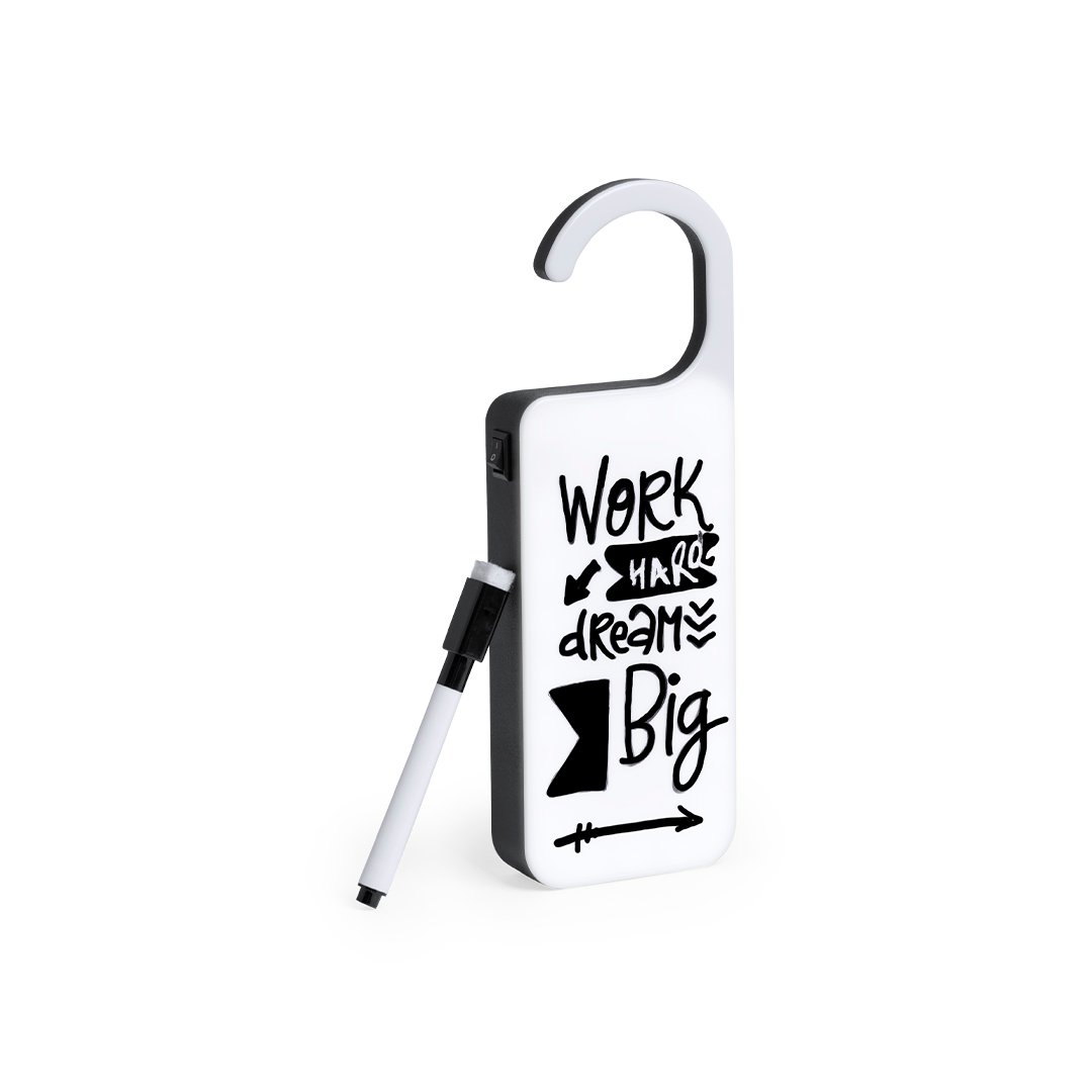 Colgador para mensajes con brillate luz interior (25 LEDs), para que todo el mundo pueda ver tus mensajitos. Botón de encendido ON/OFF, con rotulador de tinta negra y borrador. Alimentación a pilas (3xAAA no incluidas) y compartimento para guardar el rotulador. Presentada en atractiva caja de diseño.