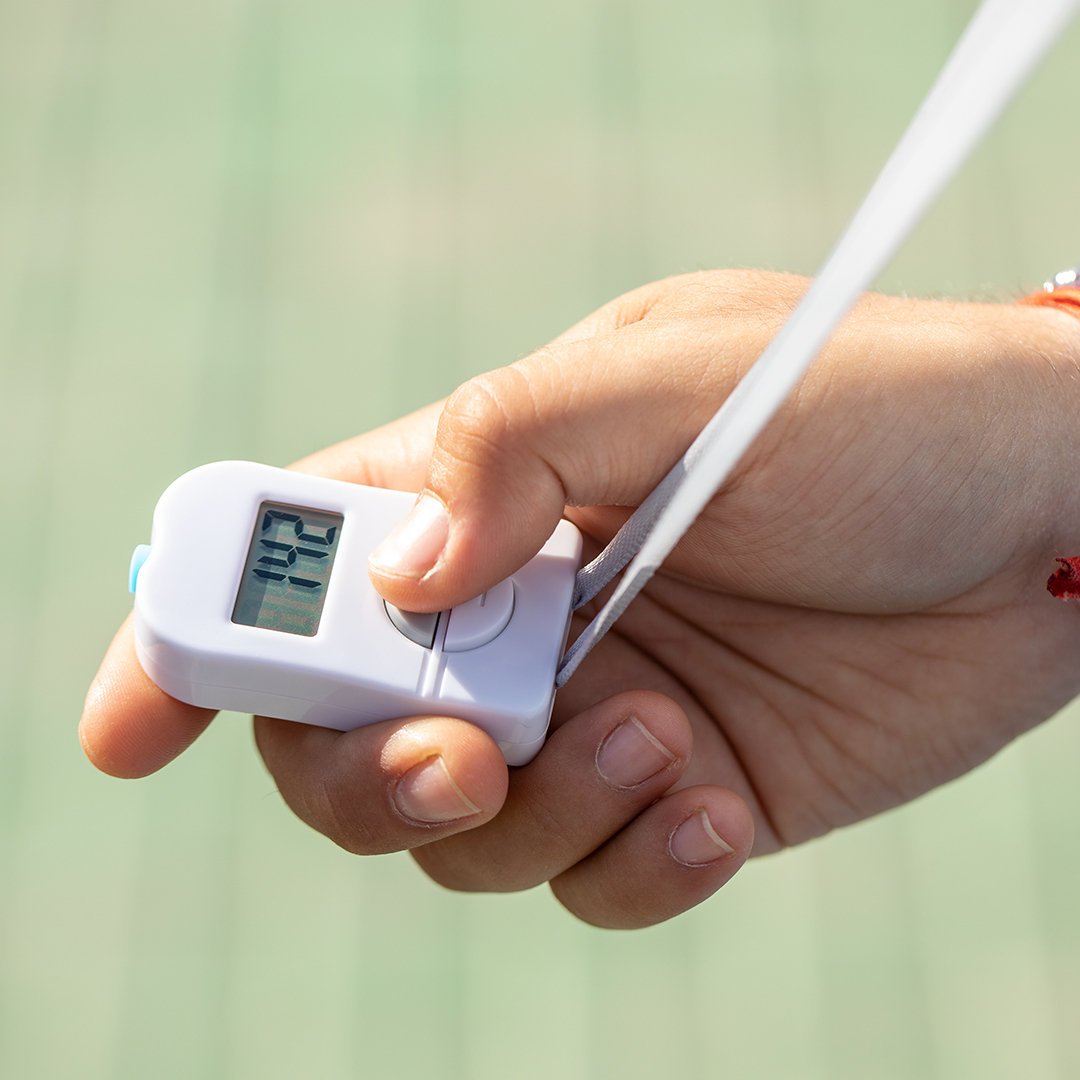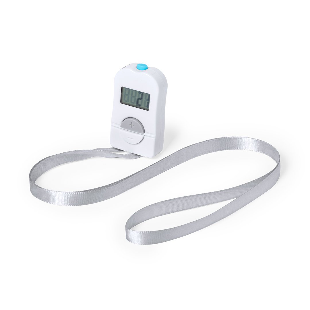Contador de aforo digital fabricado en resistente material ABS de acabado brillo, con práctica cinta de poliéster y amplios pulsadores para añadir o restar aforo. Pantalla digital con contador de 4 dígitos y botón de reinicio en parte superior. Amplia superficie para logotipo, especialmente diseñado para marcaje en tampografía. Presentado en atractiva caja individual de diseño. Alimentación a pilas, de botón incluida.