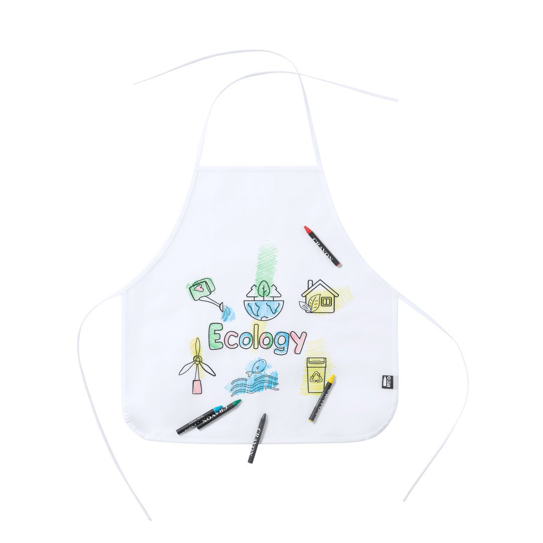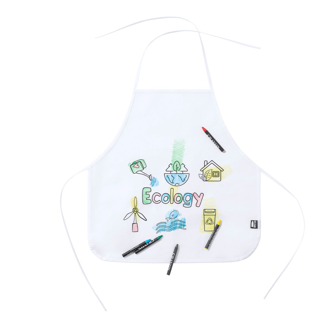 Delantal fabricado en non-woven RPET de color blanco, especialmente diseñado para colorear con ceras. Incluye 5 ceras en variados colores. Con cintas de ajuste en cuello y cintura. Distintivo RPET en etiqueta exterior.El material RPET se elabora a partir de plástico reciclado, para así fomentar la reutilización de residuos plásticos y ayudar a la sostenibilidad del planeta.