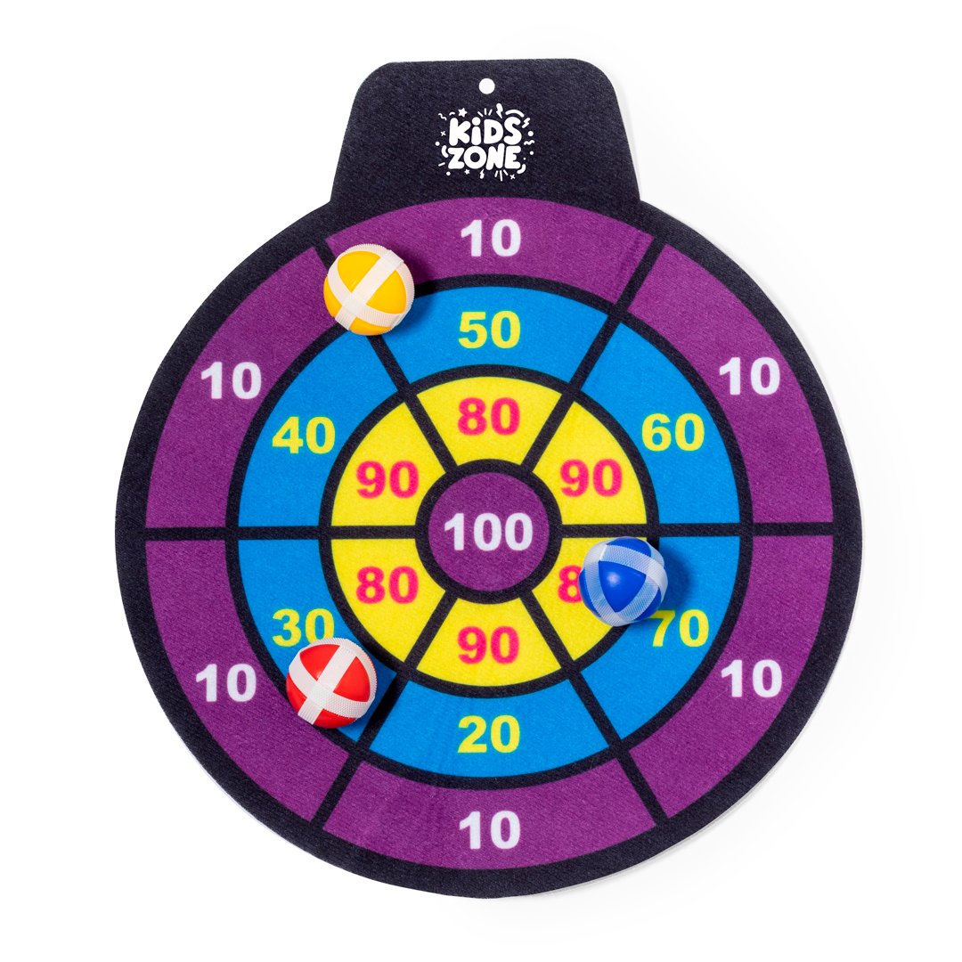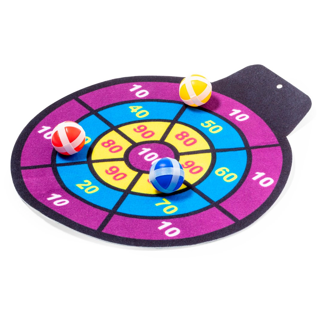 Divertida diana de tela con pelotas de velcro. Perfecta para todas las edades ofreciendo un objetivo desafiante y seguro. El juego consiste en lanzar a la diana con puntuaciónes las pelotas de distintos colores, que se quedarán fijas gracias a su envoltura de velcro. Fácil de colgar en cualquier sitio y a cualquier altura mediante agujero. Incluye diana de tela flexible y 3 pelotas con velcro. Presentado en bolsa reciclada.