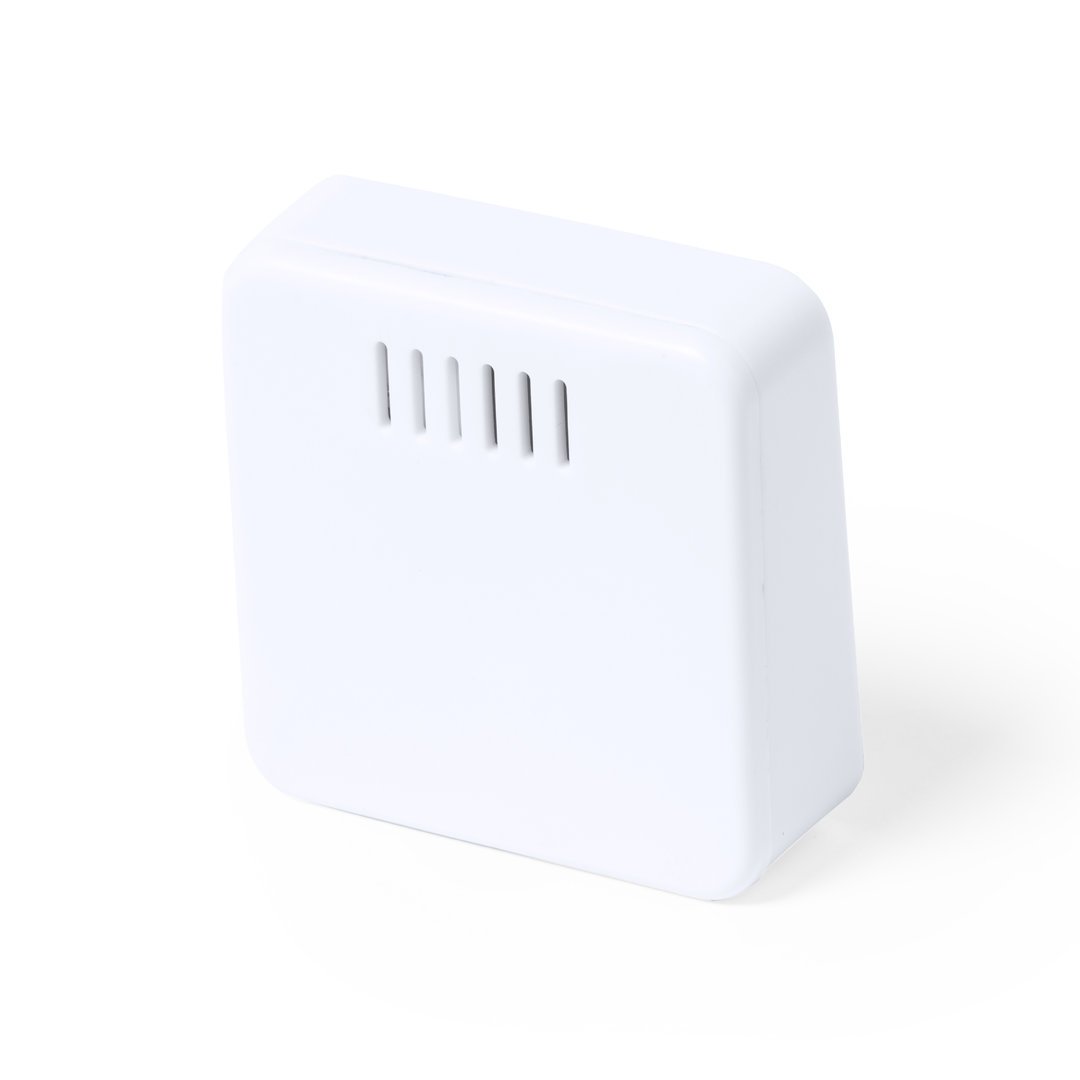 Estación meteorológica fabricada en resistente ABS de acabado blanco. Pantalla LCD de fácil lectura con termómetro y medidor de humedad. Fijación magnética y alimentación con pila (de botón incluida, con film protector). Presentada en caja individual de diseño kraft, con manual de instrucciones en español e inglés.