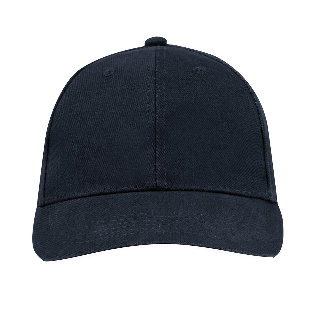 Gorra de 6 paneles fabricada en resistente algodón peinado de 250g/m2. Con sandwich en visera, orificios de ventilación bordados y cierre con hebilla metálica.