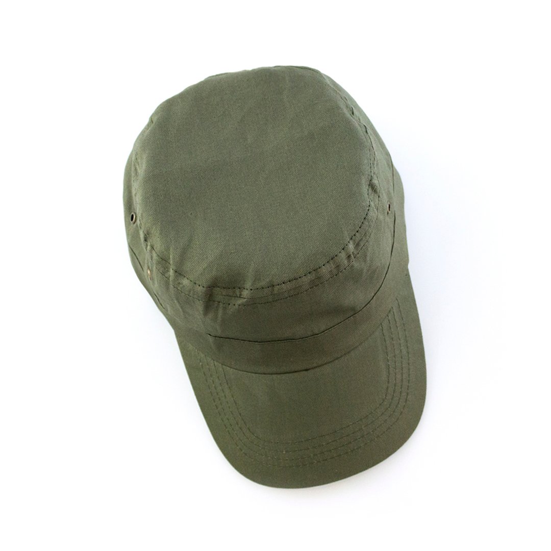 Gorra tipo militar en material 100% algodón peinado y sobrios colores. Con orificios de ventilación laterales reforzados con argolla metálicas y cierre ajustable de velcro.