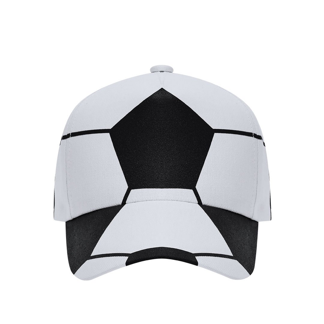 Gorra deportiva con original diseño de balón de fútbol de 5 paneles en algodón. Ajustable cierre de velcro.