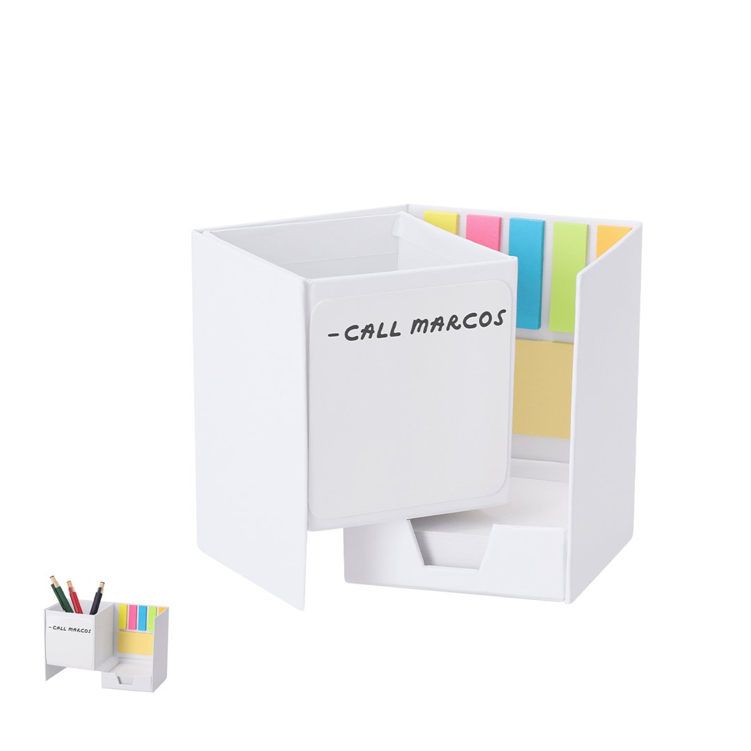 Lapicero Portanotas Pizarra en cartón reciclado. Práctico cubo desplegable con 170 hojas de 7×7 cm y 125 mininotas adhesivas de 3,8x 1,2cm en variados colores, 25 mininotas de 7,5 x 3,5 cm con práctico hueco para usar como lapicero. Lado frontal con función pizarra.