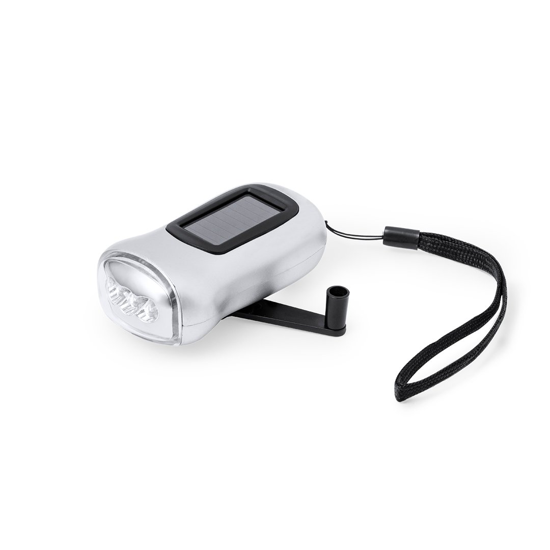 Linterna solar de mano, fabricada en resistente ABS. Su versatilidad con su doble función de carga: mediante la placa solar incorporada y de forma manual gracias a la dinamo integrada, ofreciendo una fuente de energía limpia y renovable reduciendo el consumo de pilas. Equipada con 3 potentes luces LEDs y un cordón que asegura un agarre firme para mayor comodidad. Presentada en caja de diseño kraft.